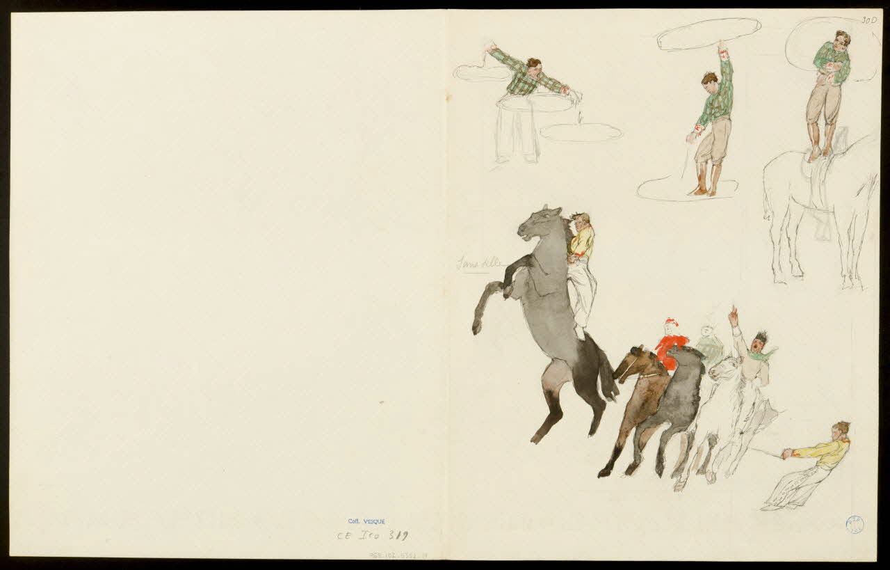 partie d'un ensemble de dessins, Spectacle à cheval et lasso