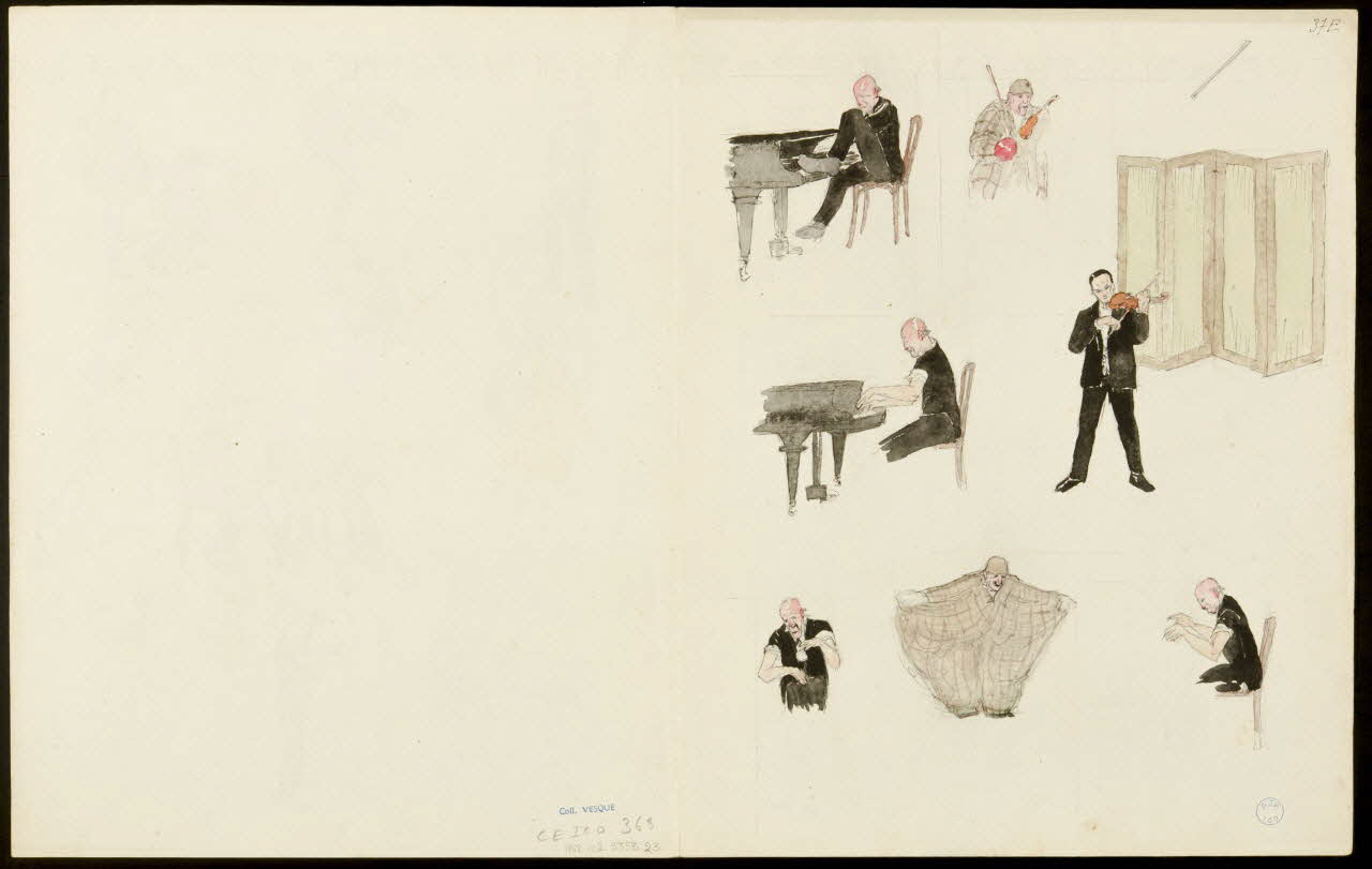 - Suite de scènes : homme : clown, clownerie, art du spectacle : cirque, instrument de musique : piano, violon, trompette, chute