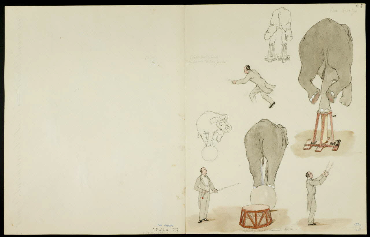 - Suite de scènes : spectacle, dressage : éléphant, homme, femme : acrobate, adresse, cirque