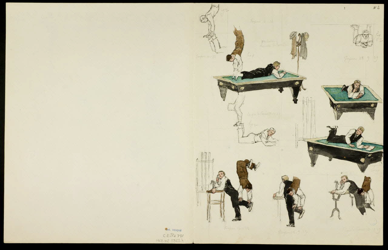 - Revers : scène : homme : acrobate, acrobatie, couché sur le ventre, billard, livre