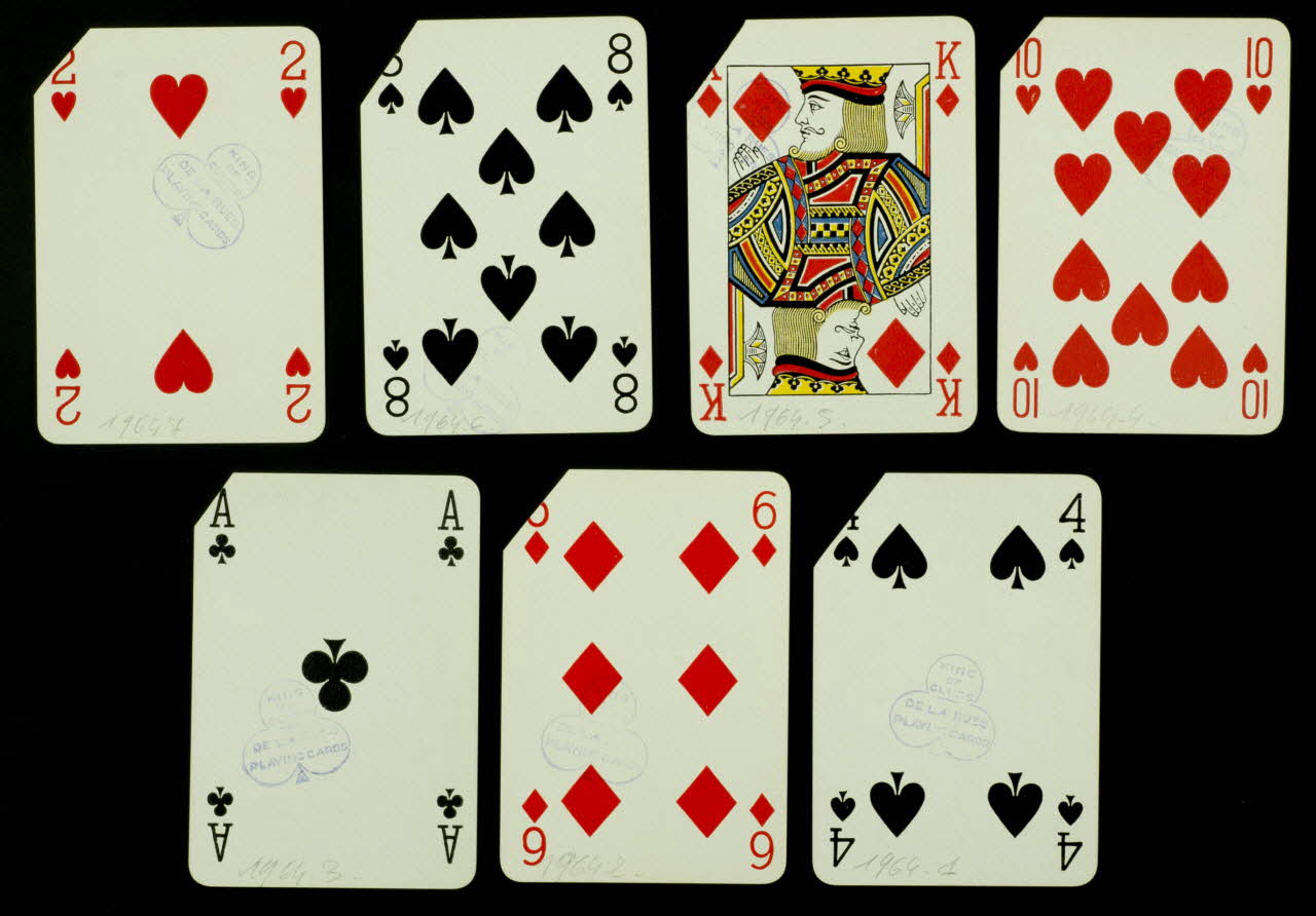 7 cartes objet marqué; impression recto-verso; 1 coin de chaque carte a été découpé; un tampon en forme de trèfle est visible sur chaque faceDécor