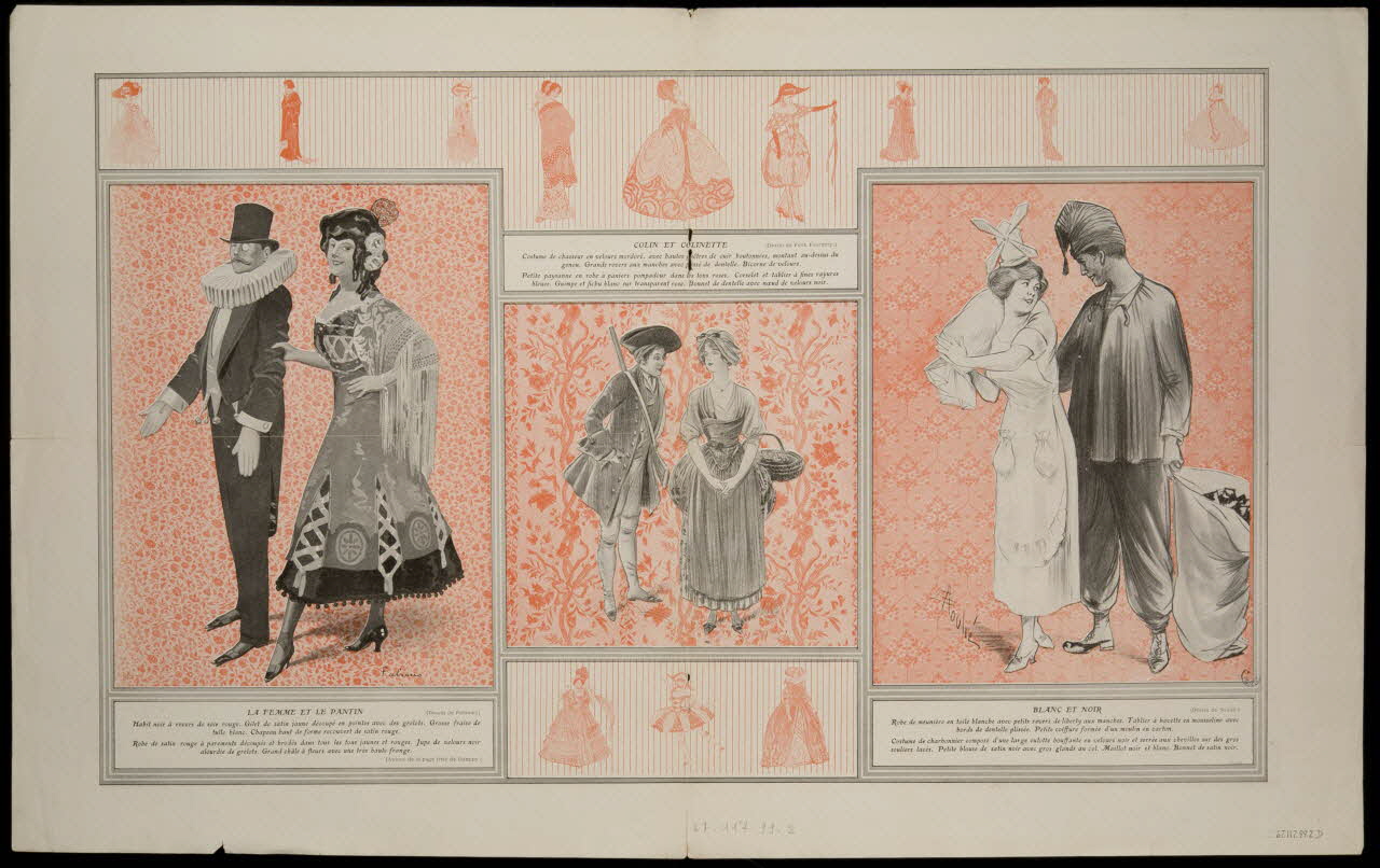 - Figures : couple, déguisement, robe, monocle, costume : soldat : Premier Empire, femme : robe, châle, homme : déguisement : pantin, couple, déguisement : soldat, déguisement : paysanne, panier, femme : déguisement : paysanne, moulin, homme : déguisement : ramoneur, couple : déguisement : vêtement : Anglais, couple, déguisement, masque, couple, vêtement : à l'oriental, Turc, couple, déguisement : Inuit, fourrure, Arlequin, Japonais, robe : Ancien Régime