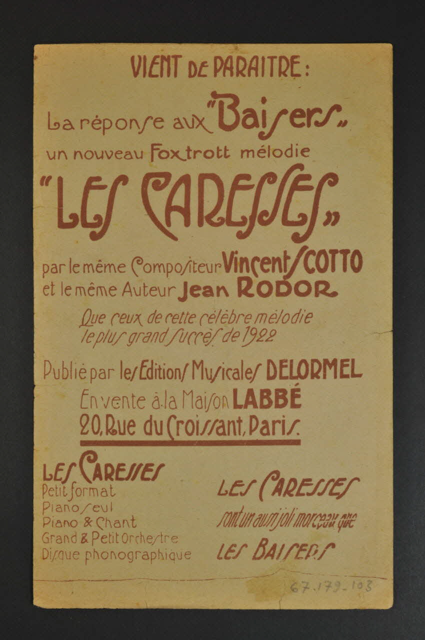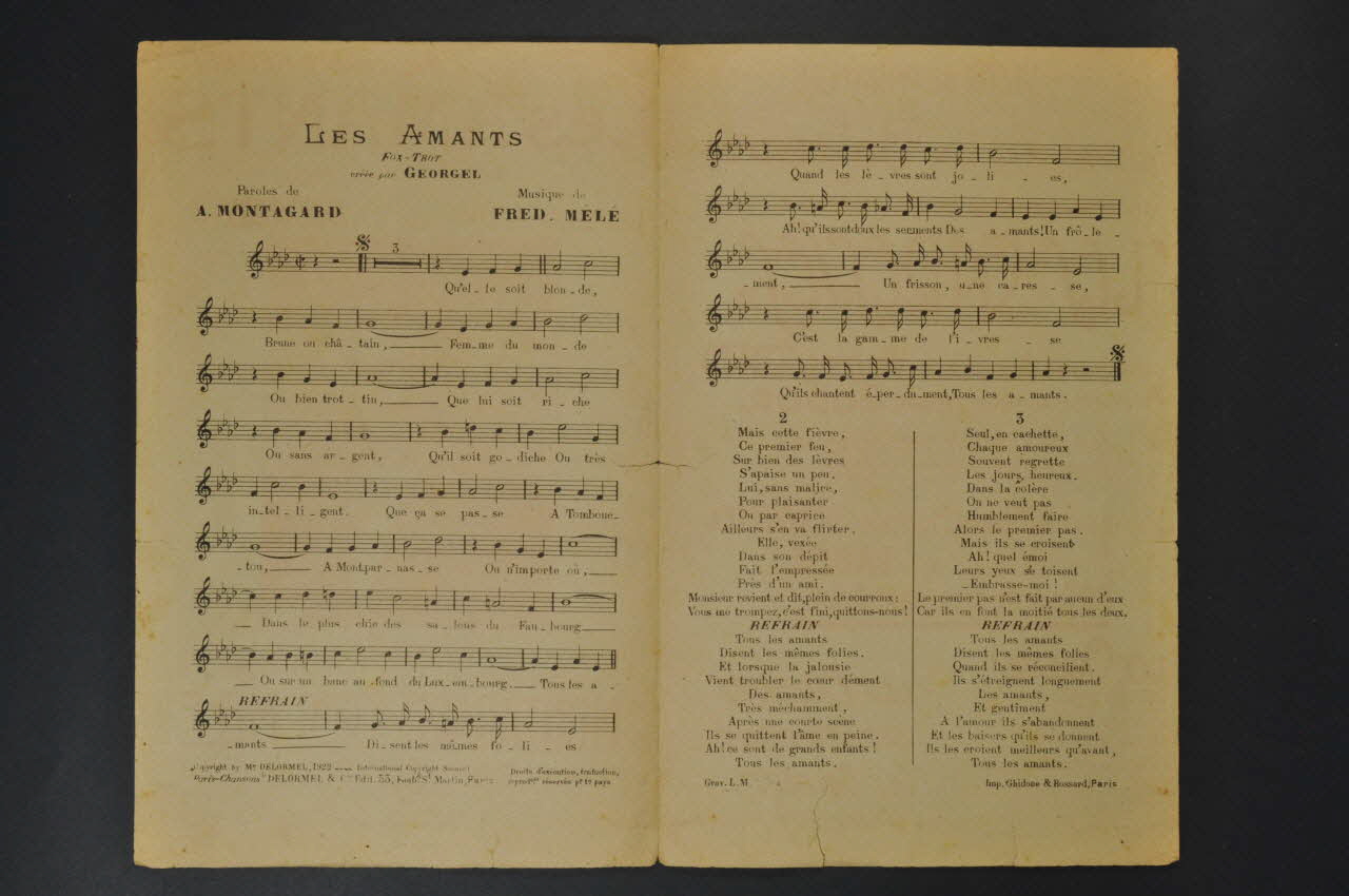 Les inscriptions renseignent le titre de la chanson, le nom des auteurs, de l'artiste et de l'éditeur. A l'intérieur, partitions et paroles de la chanson. Au dos, liste d?autres partitions publiées par l?éditeur.Matériaux et techniques