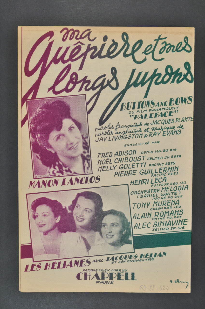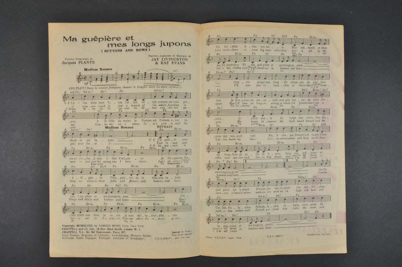 Les inscriptions renseignent le titre de la chanson, le nom des auteurs, de l'artiste et de l'éditeur. A l'intérieur, partitions et paroles de la chanson. Au dos, liste d?autres partitions publiées par l?éditeur.Matériaux et techniques
