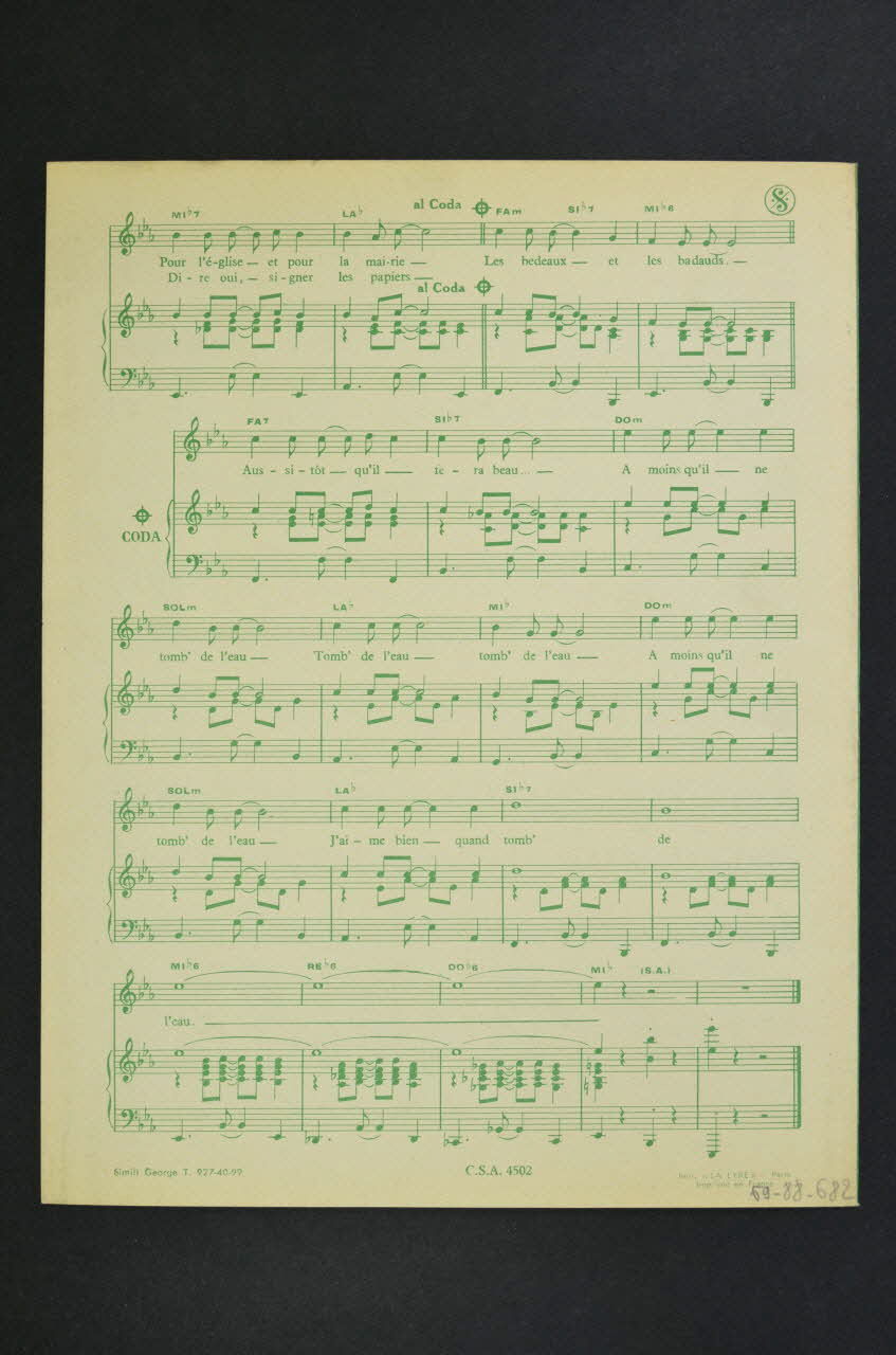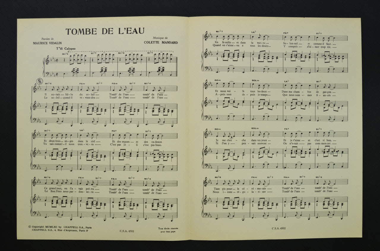 Sur la couverture, le portrait photographique de Marcel Amont dans un encadrement rectangulaire, intégré à l'illustration : averse de pluie stylisée. Les inscriptions renseignent le titre de la chanson, le nom des auteurs, de l'artiste et de l'éditeur. A l'intérieur et au dos, partition et paroles de la chanson.Matériaux et techniques