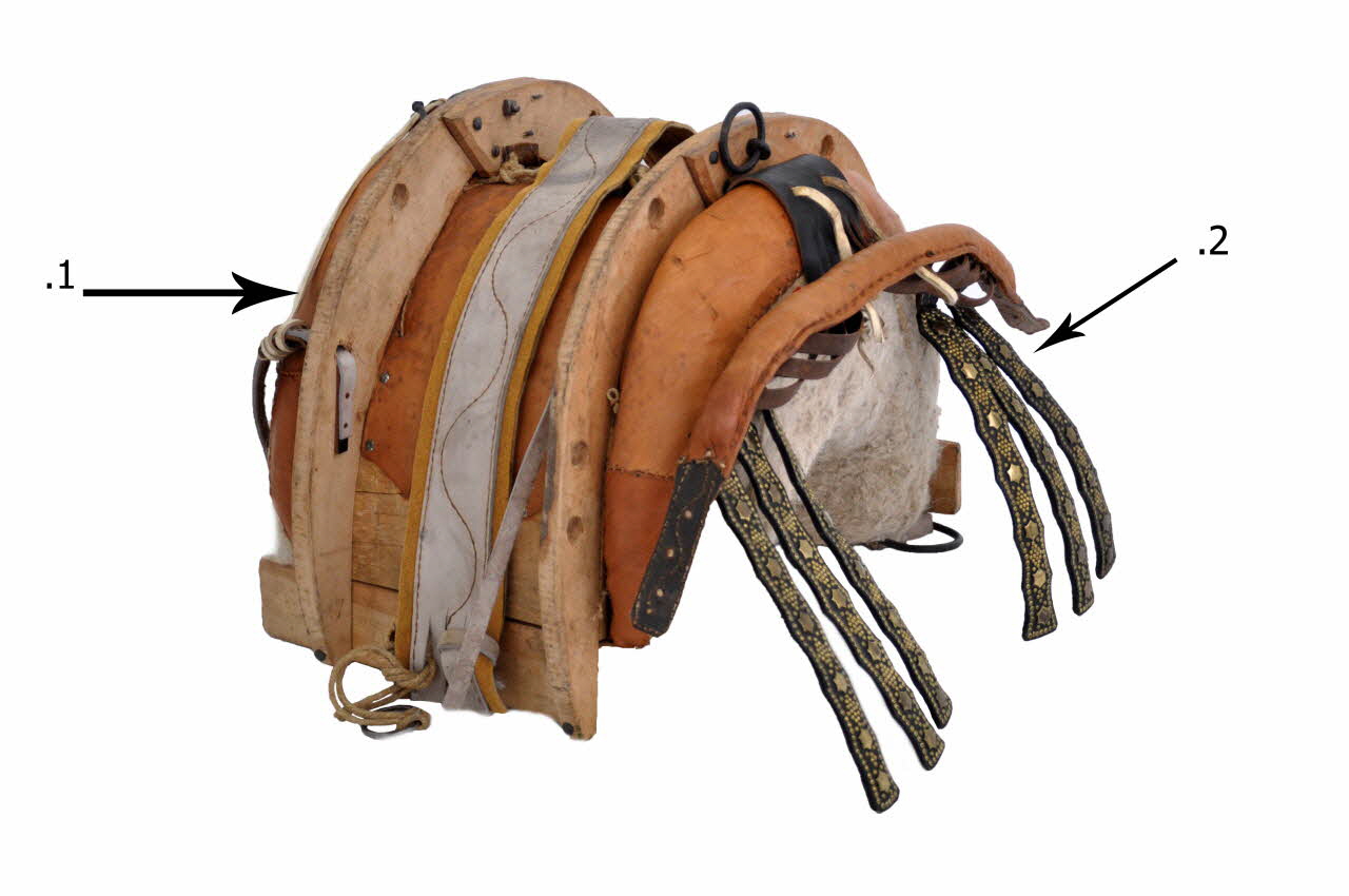 Il s'agit d'un harnachement de mulet (.1), appelé "bast ". Il se pose sur le dos du mulet comme une selle. Le chassis est en bois. Le bourrage est composé de toile et de fibres animales. Des pièces de cuir renforcent et maintiennent le bourrage sur la face supérieure. La face inférieure, sur le dos de l'animal est faite de fibres animales.