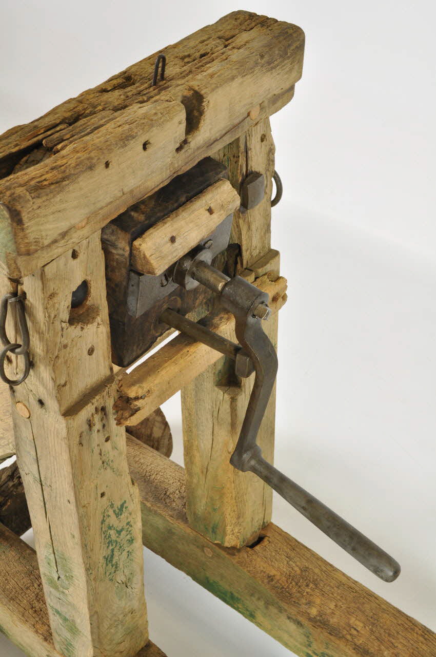 Porte-crochet avec pièce carrée de bois, teintée au brou de noix, accrochée à un chariot à cordage par une traverse en acier. Deux grosse poutres (.3) la relient avec le chariot. La pièce est également traversée transversalement en son centre, par l'axe d'un crochet en acier (.8). Une longue manivelle en acier est reliée au crochet par un clou. Au dos, une petite traverse de bois brut biseautée est clouée.Matériaux et techniques