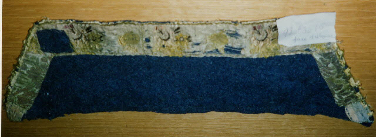 De forme trapézoïdale, en laine bleue bordée, sur trois côtés, d'un ruban en soie jaune broché de fleurs en fils métalliques dorés. Un ruban d'attache en drap de laine bleu à chaque extrémité.Matériaux et techniques