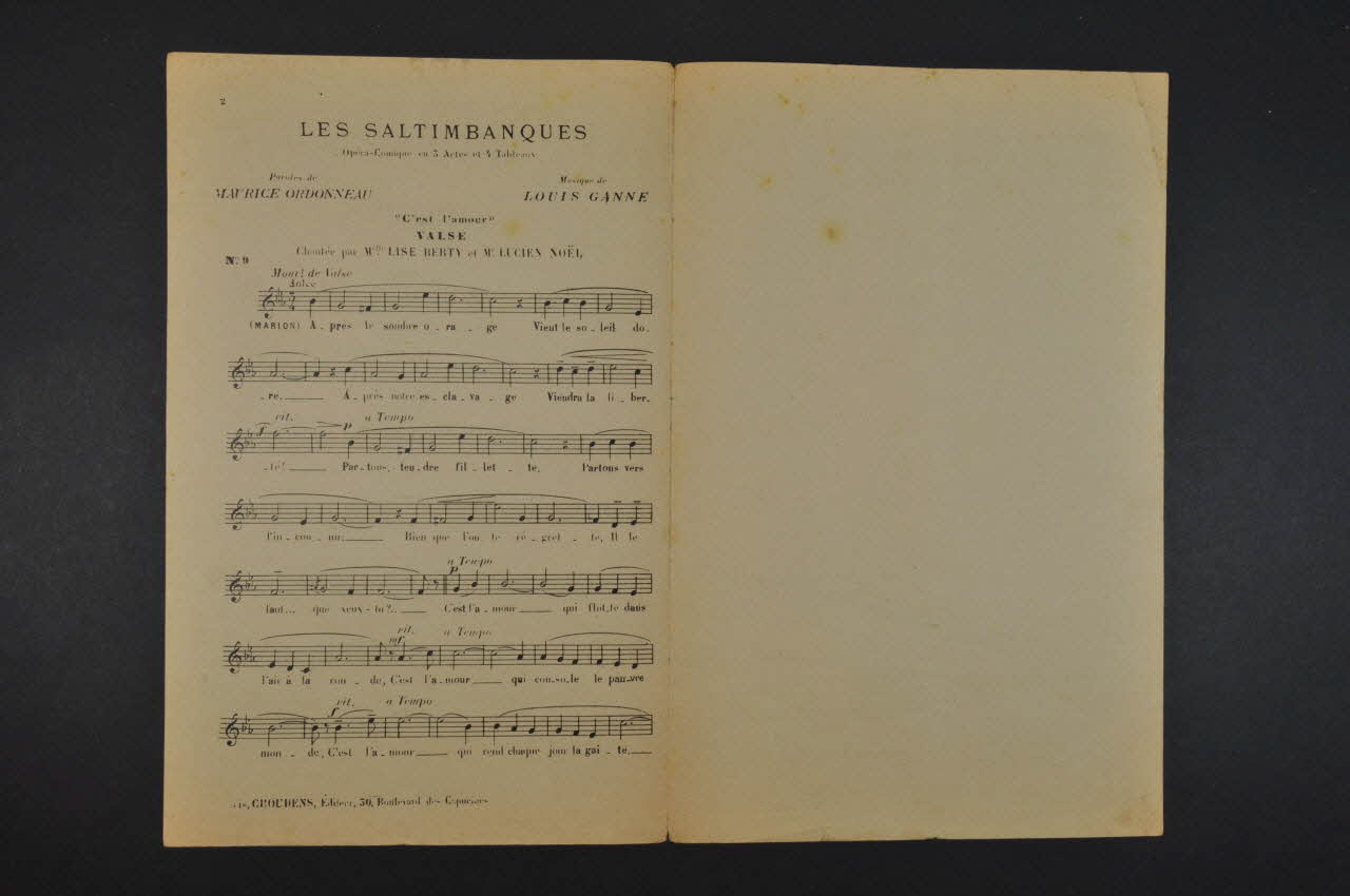 Les inscriptions précisent l'auteur de la chanson, les interprètes et l'éditeur du feuillet. L'intérieur comporte la partition et les paroles. Au dos, une liste d'autres titres disponibles chez le même éditeur.Matériaux et techniques