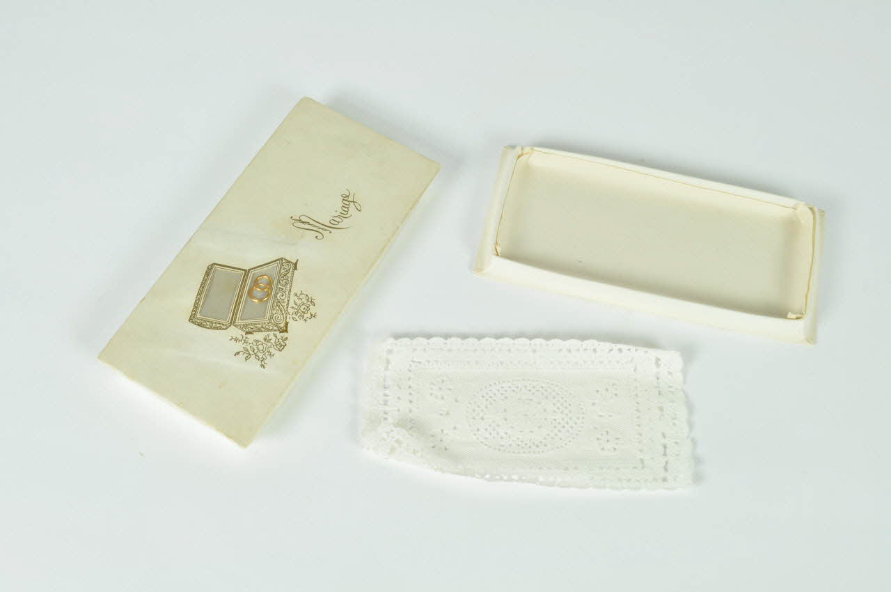 A l'intérieur, étiquette dorée décorée de deux oiseaux marquée et inscription manuscrite. Partie interne détachée en papier dentelle.Inscriptions