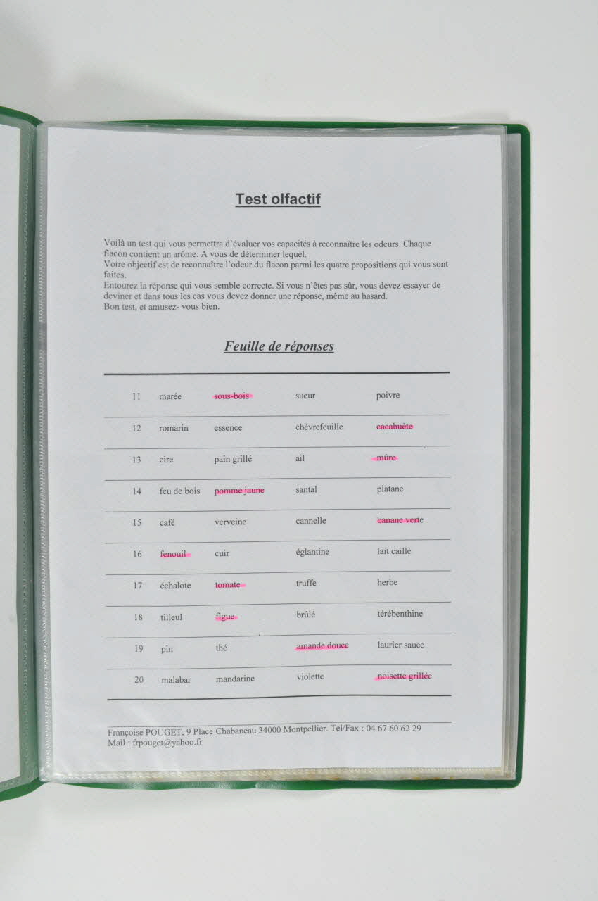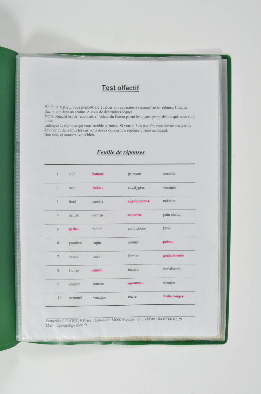 Porte-vue avec une couverture verte, il contient deux feuilles rangées dans deux de ses 20 vues. Les deux feuilles de papier présentent un test olfactif correspondant aux flacons des deux boîtes en plastique inv2002.192.3 et inv2002.192.13.Matériaux et techniques