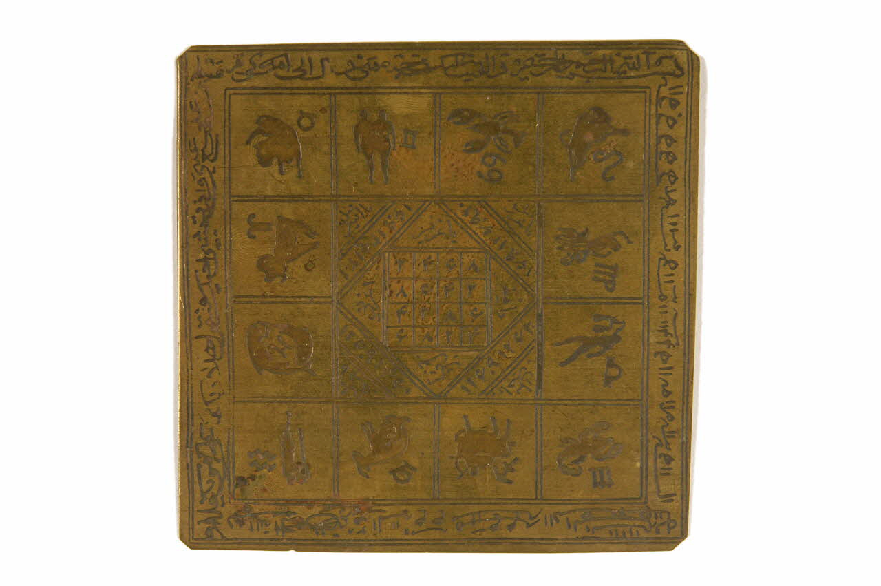 Plaque de forme carrée représentant en son centre un carré magique à 16 cases inscrites chacune d'un chiffre, inserré dans un losange dans les écoinçons duquel se trouvent des inscriptions. Autour de ce motif central, représentation des signes du zodiaque. En bordure, inscriptions.Décor