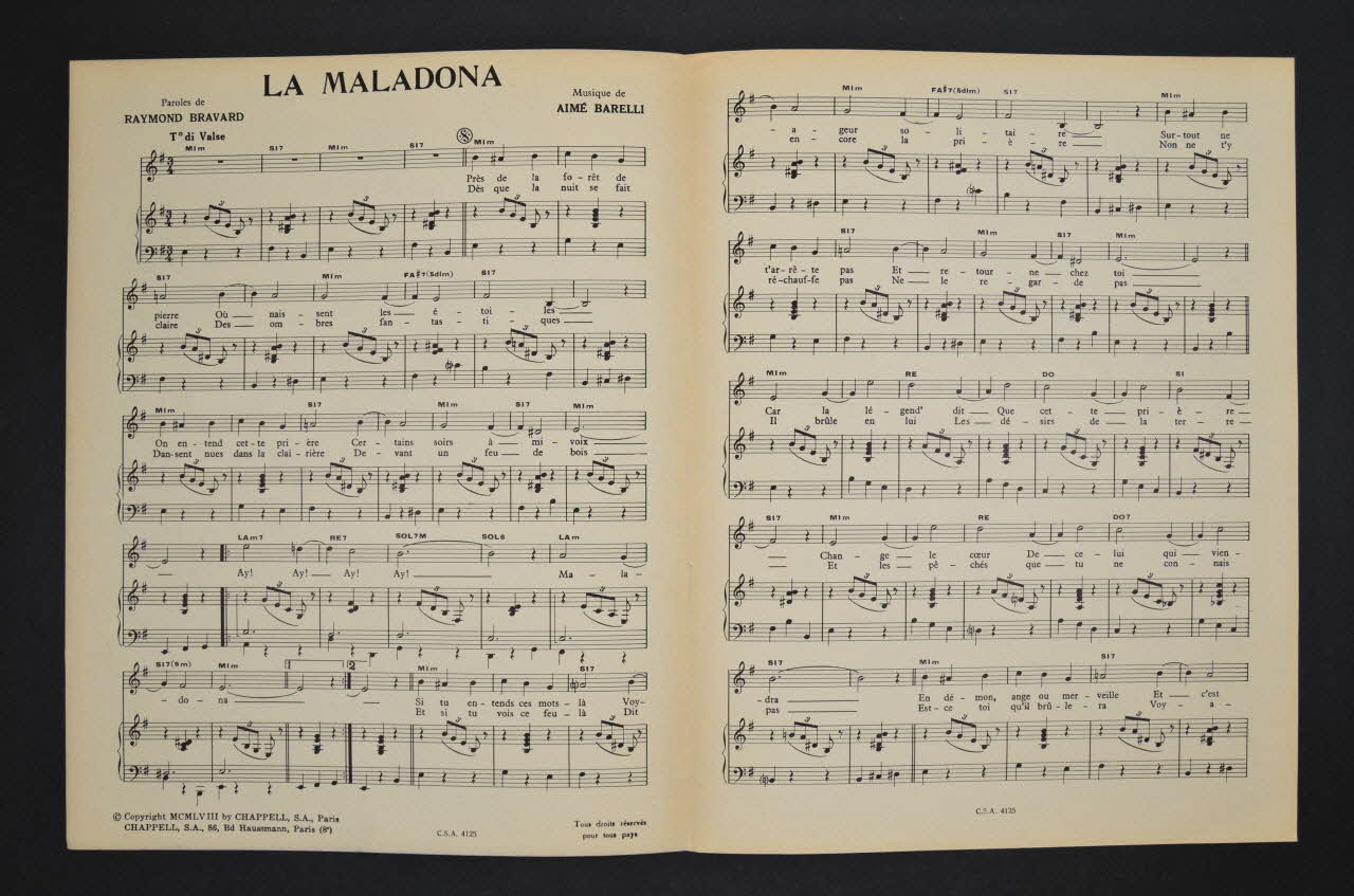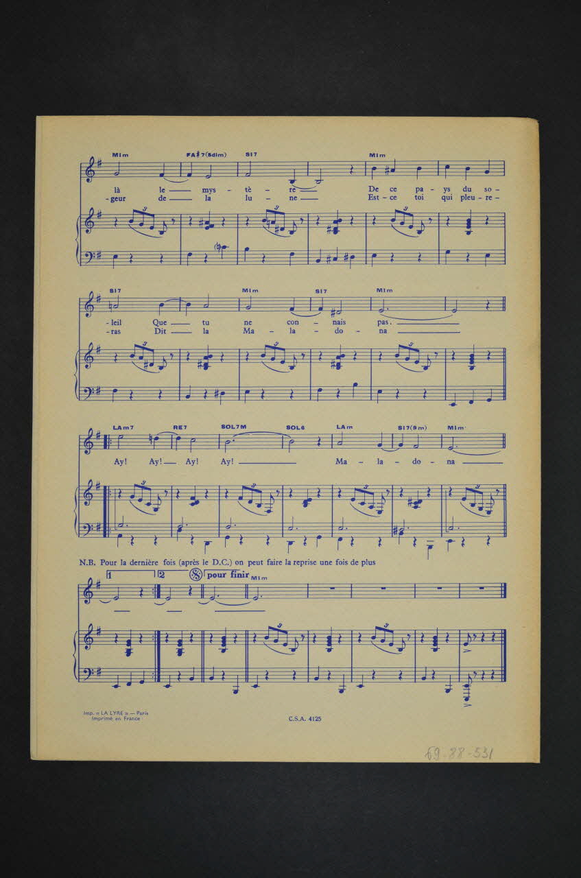 Les inscriptions renseignent le titre de la chanson, le nom des auteurs, de l'artiste et de l'éditeur. A l'intérieur et au dos, la partition et les paroles de la chanson.Matériaux et techniques