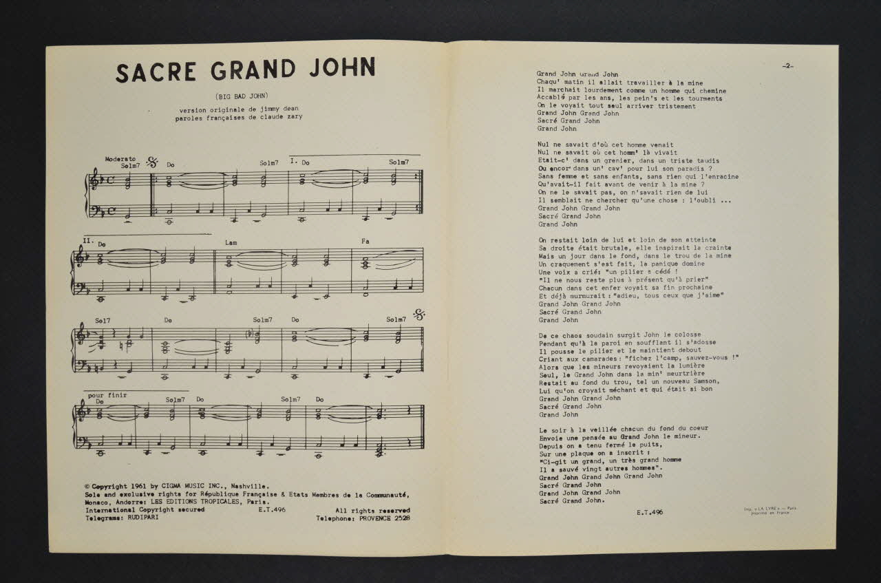 Feuillet rectangulaire en papier industriel, imprimé à l?encre jaune (sauf l?intérieur à l?encre noire). La couverture du feuillet présente la photographie de John William.
