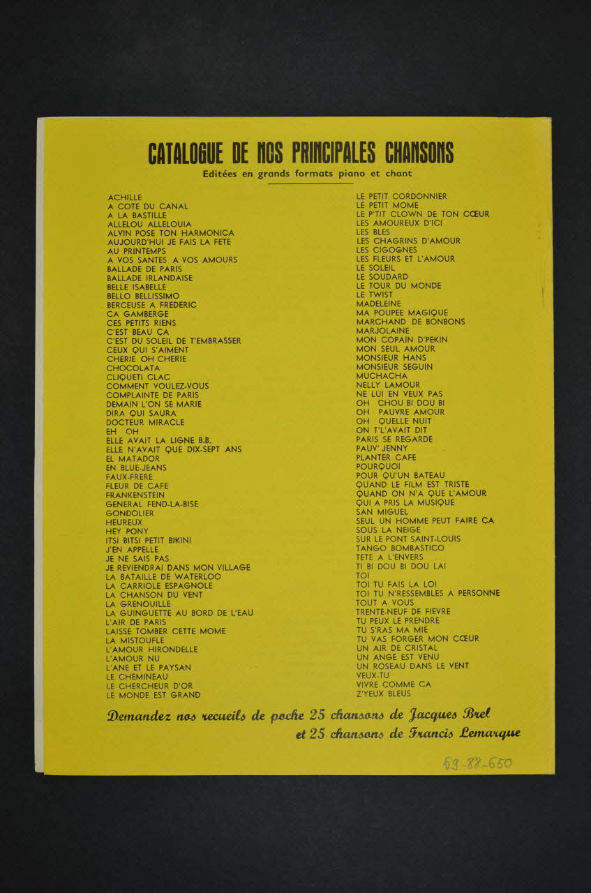 Les inscriptions renseignent le titre de la chanson, le nom des auteurs, de l'artiste et de l'éditeur. A l'intérieur, partitions et paroles de la chanson. Au dos, liste d?autres partitions publiées par l?éditeur.Matériaux et techniques