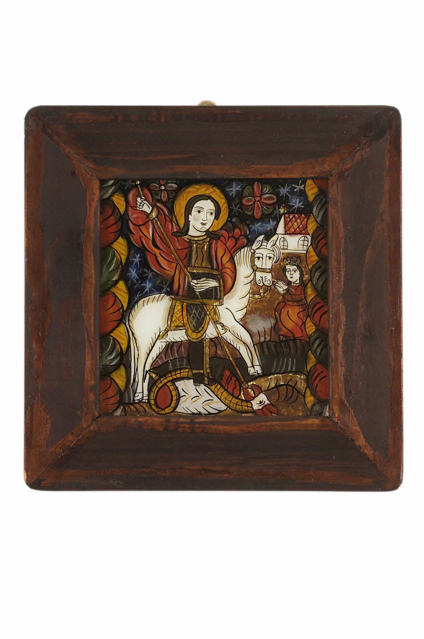 Représentation de Saint Georges terrassant le dragon de sa lance dorée. Entre deux bordures de motifs arrondis verts jaunes et rouges, sur un fond bleu étoilé (typique de Figaras) décoré de deux motifs floraux verts et rouges, la figure de Saint Georges sur son cheval blanc. Au sol, le dragon terrassé. Le saint auréolé est vêtu de rouge et doré et derrière lui se trouvent des flammes. Sur la droite, devant un bâtiment blanc et rouge, la fille de l'Empereur a les mains jointes.Décor