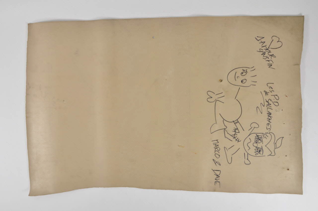 Morceau rectangulaire de linoleum orange, présentant, sur le revers, à l'encre noir, très stylisée, une scène de sodomie et de nombreuses inscriptions.Inscriptions