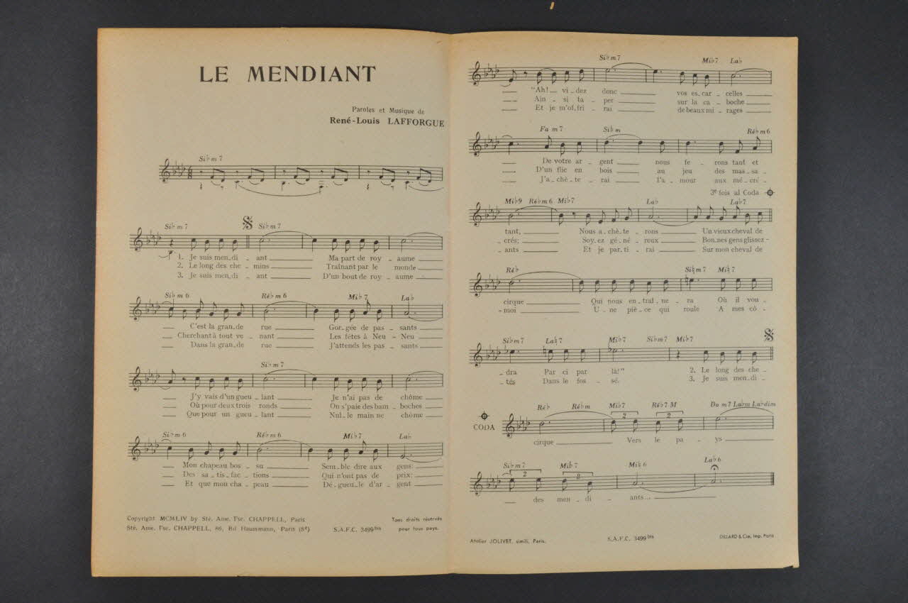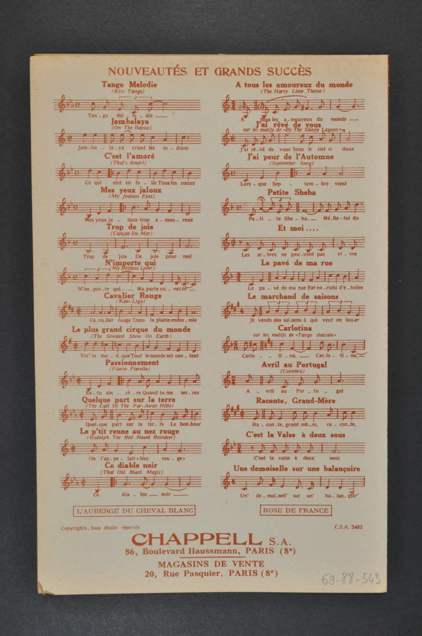 Des inscriptions renseignent le titre, les auteurs, les exécutants et l'éditeur. A l'intérieur, partition et paroles de la chanson. Au dos, liste d'autres partitions publiées par l'éditeur.Matériaux et techniques