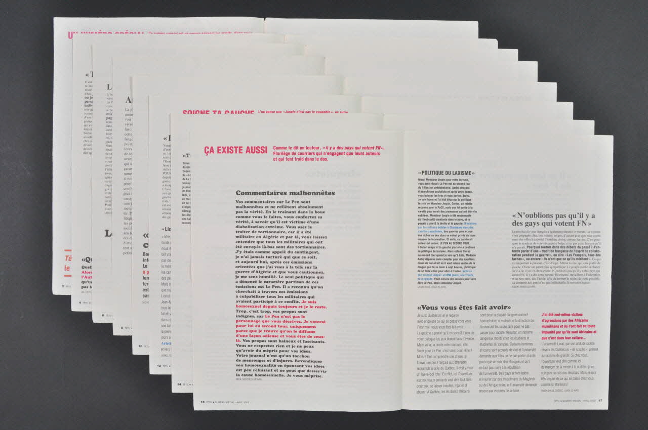 Edité entre les deux tours des élections présidentielles. Dans l'éditorial, à propos du sida : "Nous sommes lesbiennes, gays, parents, amis ou proches d'homosexuels. Nous nous battons pour l'égalité des droits entre homosexuels et hétérosexuels. Nous faisons partie, ou nous soutenons, des associations de lutte contre le sida. Le 21 avril, Jean-Marie Le Pen a obtenu 4 805 307 voix, Bruno Mégret 667 123. Nous avons peur, nous sommes désespérés, nous sommes en colère. Jean-Marie Le Pen nous veut du mal. Il y a quelques jours seulement, avant le second tour, sur l'antenne de M6, le candidat du Front National essayait de convaincre qu'il n'était pas raciste en lâchant : "Ecoutez, mon personnel de maison est noir, mon cuisinier est noir (...) que faut-il que je fasse? Que je me marie avec un noir, homosexuel et sidaïque?" Jean-Marie Le Pen ne dit jamais sidéen, pour désigner les malades du sida, il dit "sidaïque". Pourquoi? Il faut être clair : Jean-Marie Le Pen veut supprimer les homosexuels, les malades du sida, les usagers de drogue, comme il veut supprimer les immigrés. Il ne s'en est jamais caché (...) Concernant le sida, Jean-Marie le pen vise clairement les homosexuels séropositifs quand il déclare en 1995 qu'il "faut distinguer les victimes innocentes et les malades de la sodomie" (France Inter, 3 mars 1995) (...) Le terrain de la gauche, n'est-ce-pas la précarité des séropositifs qui survivent avec l'AAH et qui se la voient supprimer s'ils signent un PACS ou si leur santé s'améliore brièvement?" A l'intérieur lettres et réactions et témoiganges ainsi d'ailleurs que certains favorables à Le Pen. Discussions sur l'attitude au premier tour d'Act Up et de Têtu n'appelant pas à voter Jospin 4 pages consacrées aux réactions des associations : associations homosexuelles (ne parlant pas du sida) et associations de lutte contre le sida : extraits des tracts de AIDES, de Act Up-Paris, et de "Ensemble contre le sida" (les .(..) sont dans la citation) : "Il faut enfermer les sidaïques dans des sidatoriums". Personne ne doit oublier cette déclaration de Jean-Marie Le Pen. Nous travaillons quotidiennement avec des femmes et des hommes, des homosexuels, des prostitués, des toxicomanes, des détenus et des étrangers, en situation régulière ou non. Dans notre travail de recherche, de prévention et d'aide aux malades, nous nous battons sans relâche contre toutes les exclusions et toutes les discriminations. Les prises de position du Front National et de Jean-Marie Le Pen mettent en grand danger la recherche et les malades, mais aussi notre combat, notre travail. Sa préférence nationale est dangereuse pour la santé publique, pour les lois qui nous protègent tous et pour notre pays. (...) Nous (...) appelons à une mobilisation générale pour dire non à la remise en cause des avancées de la lutte contre le sida et non aux discriminations. Pour dire non à Le pen, tous ensemble le 1er mai."