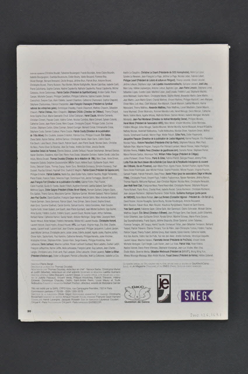 GKC // Question de Genre // // je // Magazine // // SNEG (Trois logos soutenant ce numéro sont placés côte à côte en partie inférieure droite.), versoTitre