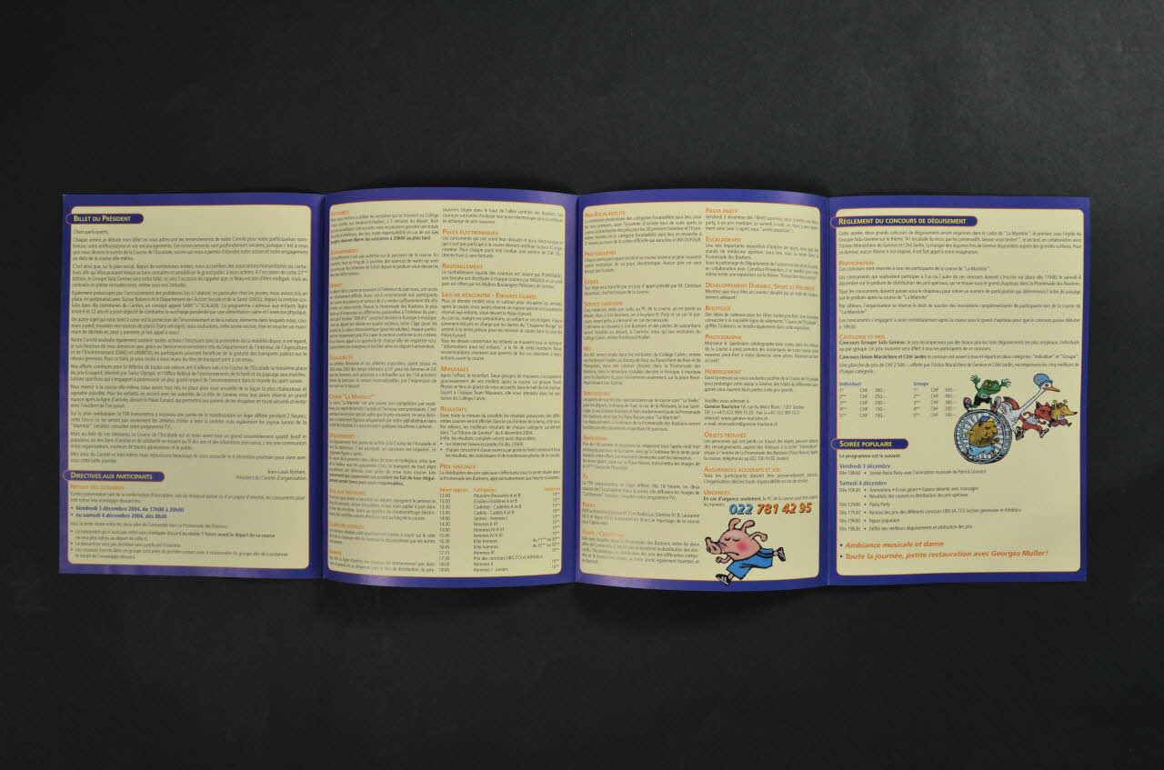 Fait partie d'un ensemble de documents donnés au stand de l'association lors de la fête de l'escalade de Genève, le 4 décembre 2004, lors de laquelle le Groupe Sida Genève a été l'hôte de la fête. Dépliant donnant des conseils pratiques aux participants et aux spectateurs de la course. Dans le billet du Président : "Sur le plan social, depuis de nombreuses années, nous accueillons des associations humanitaires ou caricatives afin qu'elles puissent mieux se faire connaître et sensibiliser le grand public à leurs actions. A l'occasion de cette 27° édition, le Groupe Sida Genève sera notre hôte ; ce sera l'occasion de rappeler que ce fléau est loin d'âtre endigué, mais au contraire en pleine recrudescence, même sous nos latitudes." Dans le réglement du concours de déguisement pour la course ludique intitulée "la Marmite" : "Cette année, deux grands concours de déguisements seront organisés dans le cadre de "la Marmite", le premier, sous l'égide du Groupe Sida Genève sur le thème : "A l'escalade du virus : par les préservatifs, laissez-vous tenter"
