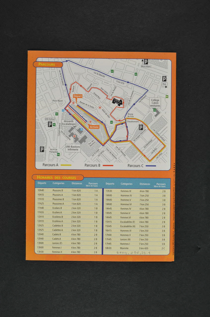 La couverture se compose d'un dessin de coureurs (garçon, souris tenant un drapeau orange, chat, porc, homme casqué, immeuble anthropomorphe...) au centre sur fond blanc, image dans un cadre orange portant un titre blanc, l'intitulé de la course en rouge, la date et un contact dans le drapeau orange. Divers logos sont visibles. Le dos comprend un plan et le tableau d'horaires des courses, sur un fond orange. Quatre volets intérieurs comprennent des textes en caractères noirs surmontés de titres dans des bandeaux bleus et de sous-titres oranges. Deux dessins de coureurs sont visibles. Les deux autres volets intérieurs, dans la continuité du recto et du dos, comprennent respectivement: - un texte sur un fond bleu en caractères noirs surmonté d'un titre dans un bandeau orange - un plan d'accès avec un dessin en bas sur un fond orangeInscriptions