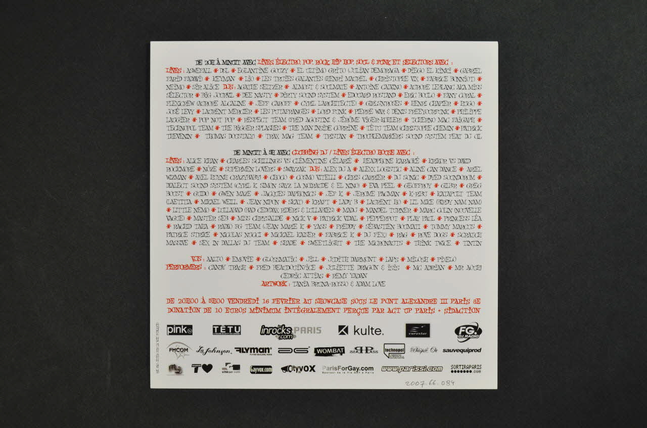 UNE ETRANGE SAINT VALENTIN // VENDREDI 16 FEVRIER2007 // DE 20H A 5H AU SHOWCASE // 100 ARTISTES CONTRE LE SIDA // WWW.UN-ETRANGE -NOEL.FR (en partie inférieure), rectoDécor