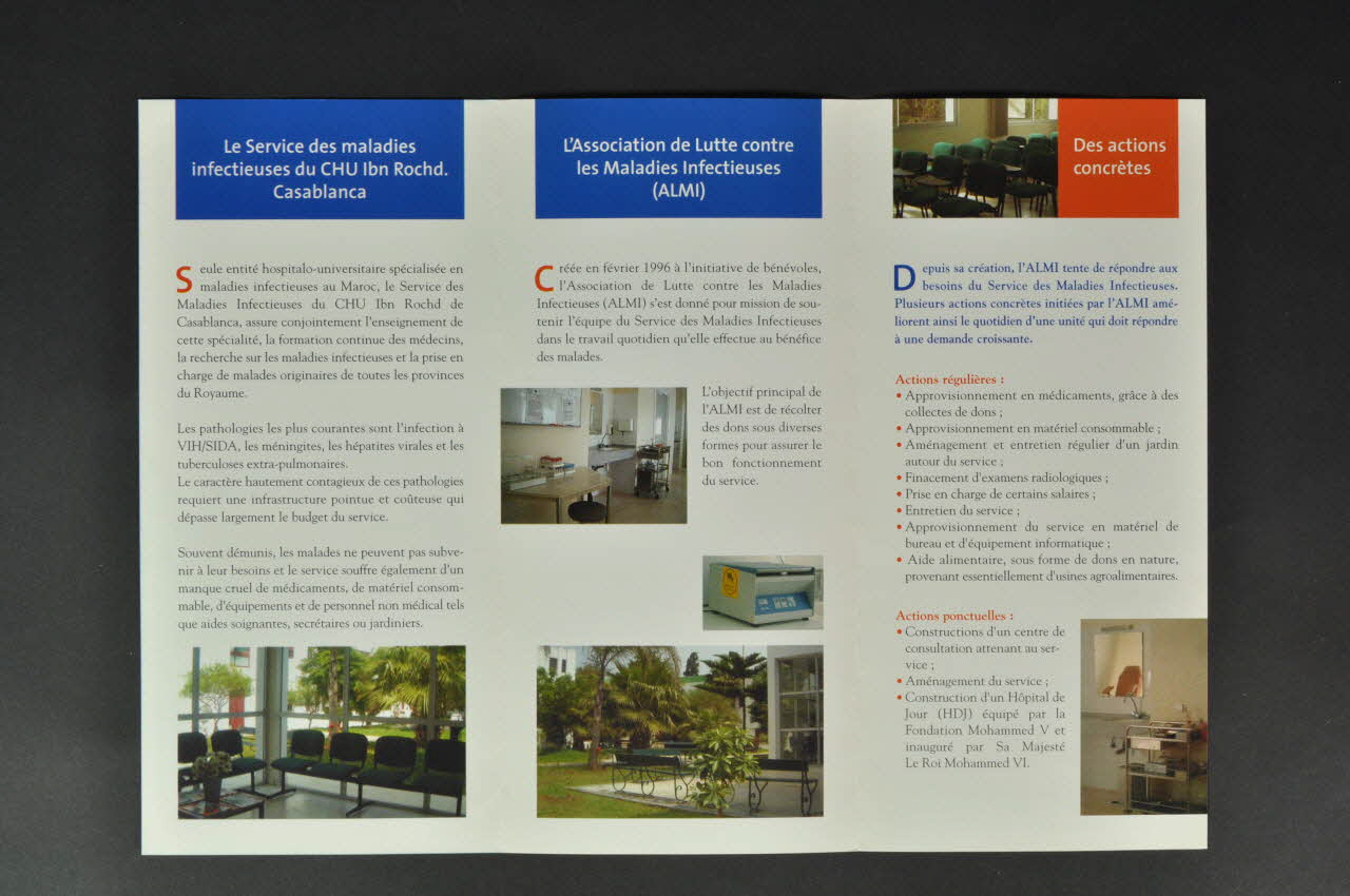 Le service des maladies // infectieuses du CHU Ibn Rochd. // Casablanca // // L'Association de Lutte contre // les Maladies Infectieuses // (ALMI) // // Des actions concrètes // Actions régulières // Actions ponctuelles // // Et des projets // // Le comité de l'ALMI (Titres situés dans la partie supérieure de chaque page.), à l'intérieurDécor