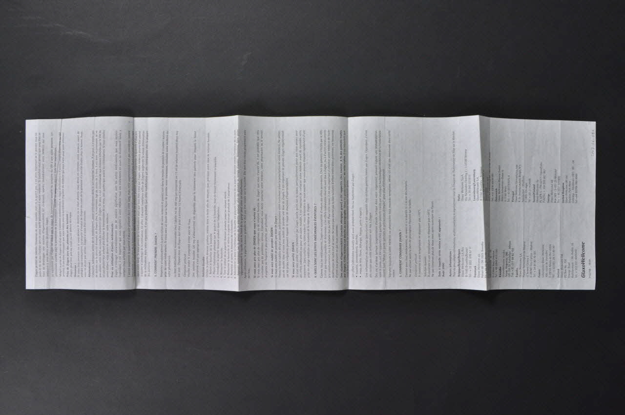 Cette notice en français est imprimée en noir sur les deux faces d'une longue feuille de papier blanc et fin. Elle a été pliée en quatre pour entrer dans la boîte de médicaments.Inscriptions