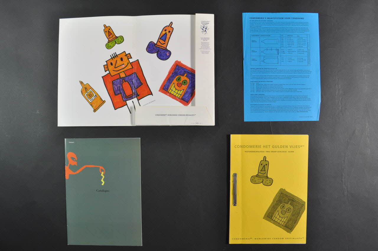 4. Catalogue de commande par mail daté de 8/2004. Il présente de nombreuses pages blanches, reliées par une barette métallique sous une couverture à fond jaune, présentant, en gris, le détail de certains dessins de l'intérieur du dossier. En haut, on trouve le nom de la condomerie. L'intérieur présente des impressions en noir, et de nombreuses illustrations humoristiques en gris. Texte bilingue hollandais et anglais.