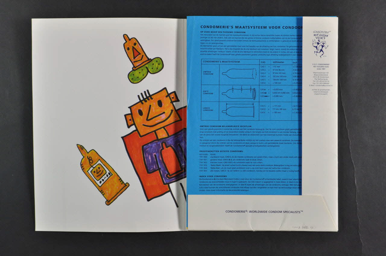 - p.6-28 Sur deux colonnes (anglais et hollandais) : historique du préservatif, types de préservatifs : textes plus développés que ceux du catalogue 2 et beaucoup plus illustrés. Textes sur religion et préservatifs, philosophie et préservatifs