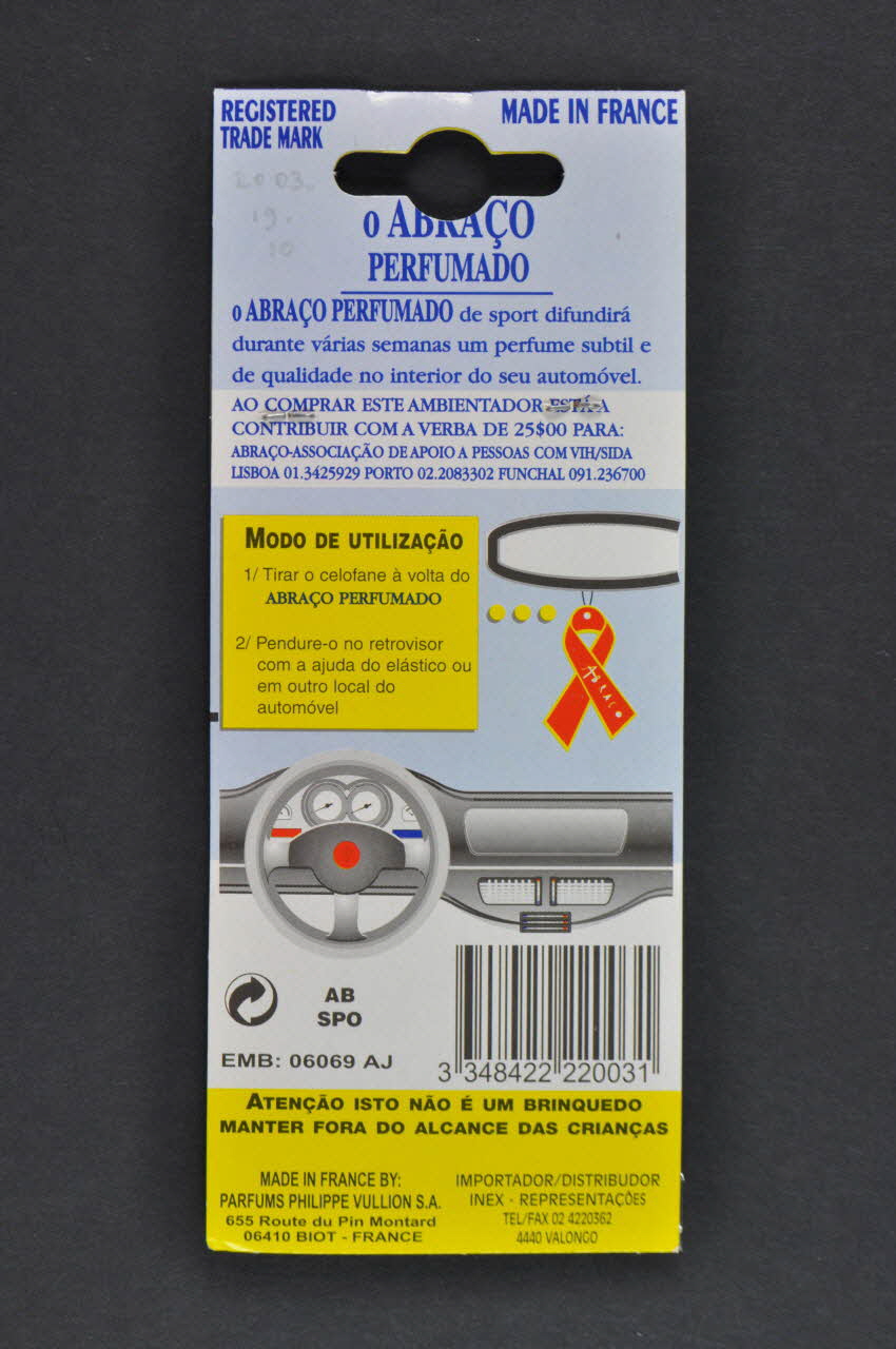 AO COMPRAR ESTE AMBIENTADOR ESTAA // CONTRIBUIR COM A VERBA DE 25$00 PARA: // ABRAÇO-ASSOCIAÇAO DE APOIO A PESSOAS COM VIH/SIDA // LISBOA 01.3425929 PORTO 02.2083302 FUNCHAL 091.236700 (Au centre, en bleu sur un bandeau blanc), versoNom d'association