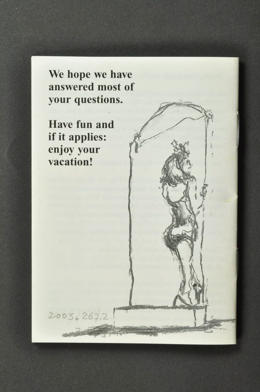 The most frequently // asked questions // about Amsterdam's // Red Light District (En haut.), rectoWelcome // to the Amsterdam Red Light District (Dans la première page en haut.), à l'intérieurWe hope we have // answered most of // your questions. // // Have fun and // if it applies: // enjoy your vacation! (En haut à gauche.), versoDécor