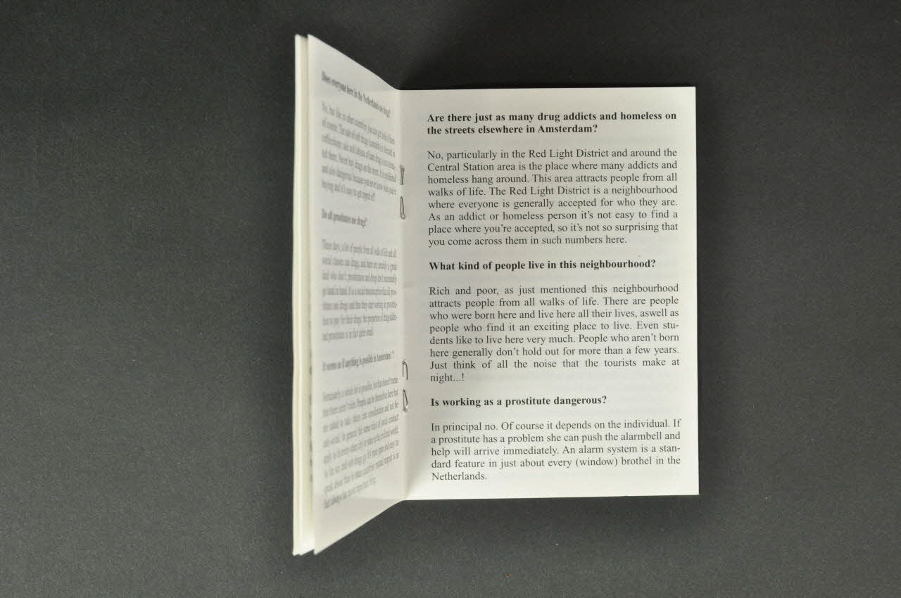 La petite est brochure imprimée en noir sur fond blanc, avec des textes en anglais. Elle conste de trois feuillets. Le dessin de la couverture, est situé en bas des inscriptions. Il présente une femme très décolletée assise et au dessus. Le dos présente le dessin d'une femme avec une jupe courte et talons, debout. En haut à gauche, il y a deux paragraphes d'inscriptions. A l'intérieur les textes parlent sur la prostitution à Amsterdam.Inscriptions