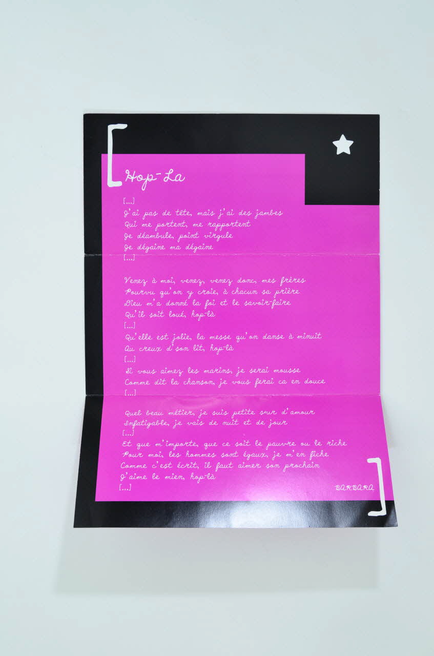 Il s'agit d'un petit dépliant en papier glacé cartonné rose réalisé à partir d'un feuillet au format A4 plié en trois volets. Sur la couverture on peut voir une date en blanc et le nom d'une manifestation. Au dos sur fond rose il y a en blanc les coordonnées de deux associations. A l'intérieur il y a un texte en blanc qui sont les paroles d'une chanson de Barbara, ce texte est signé. Les logos de deux associations apparaissent sur un dernier volet.Inscriptions