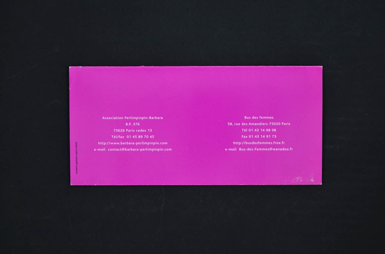 Bus des femmes // 58, rue des Amandiers 75020 Paris // http://busdesfemmes.free.fr // bus-des-femmes@wanadoo.fr, versoAssociation Perlimpinpin // BP 376 // 75626 Paris Cedex 13 // http://www.barbara-perlimpinpin.com // contact@barbara-perlimpinpin.com, versoTitre