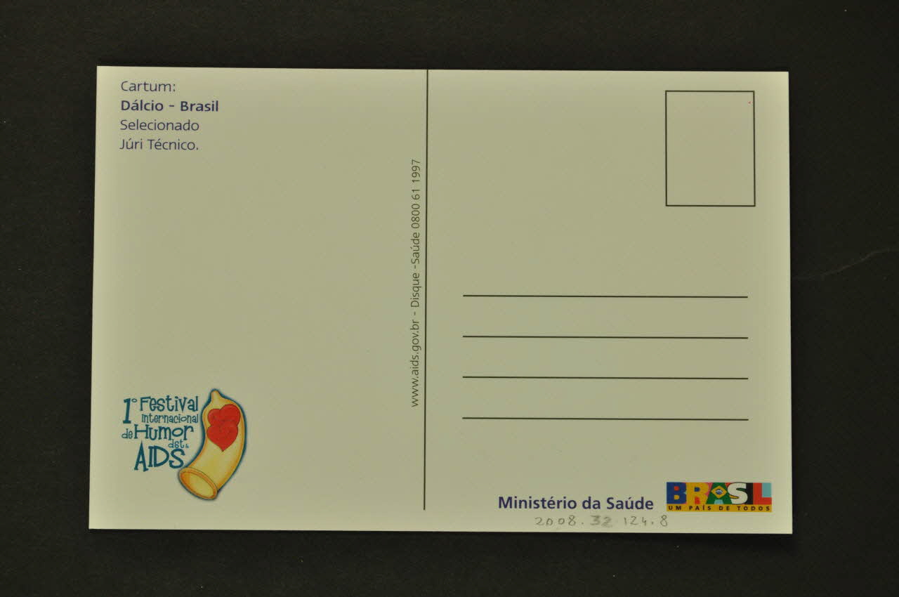 Ministério da Saúde BRASIL UM PAIS DE TODOS (en bas à droite), verso1° Festival // internacional // de Humor // dst & // AIDS (en bas à gauche, avec un dessin de deux coeurs dans un préservatif.), versoAdresse, date