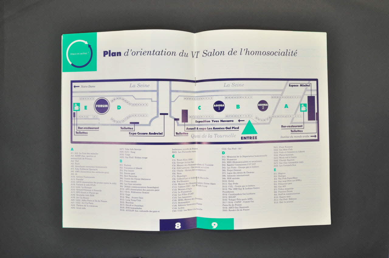 Sommaire par F.Loux : - p.3. Mot de bienvenue. (A la fin du mot) :"Ce Salon sera bien sûr aussi l'occasion d'évoquer les questions et les souffrances que la communauté homosexuelle affronte depuis de nombreuses années maintenant, à savoir les questions liées au sida. Prévention, prise en charge, aide aux malades feront ainsi, à travers les stands, les débats et les animations, l'objet d'une attention et d'un traitement particuliers. Nous tenons d'ailleurs, dans ce domaine, à remercier le ministère des Affaires sociales, de la Santé et de la Ville, dont le soutien a grandement facilité la tenue de ce Salon." - p.4. Programme heure par heure (ce qui concerne le sida dans le programme ) - Programme vidéo : "Le sida à l'écran" : "Quelques -uns des meilleurs films du concours "3000 scénarios pour un virus" du CRIPS Ile-de-France / Clips vidéo (français et italiens) présentés dans le cadre du Festival VIH Sida organisé par Artcom. / Les campagnes de prévention contre le sida en Angleterre, Australie, Brésil, Colombie, Espagne, France, Norvège, Sénégal, Suède, Suisse... Sélection de publicités réalisée par Communication CB News / La prévention à l'affiche, les campagnes réalisées dans différents pays du monde à l'intention des homosexuels (affiches du fonds documentaire constitué par le CRIPS Ile-de-France)" - Débat : "Les 15 questions le plus posées à Sida Info Service" : "Les questions posées à Sida Info Service sont révélatrices des préoccupations des gais et des lesbiennes ainsi que de l'évolution de leurs modes de vie. Un jeu de questions-réponses, plutôt qu'un débat au sens classique du terme, pour dissiper quelques malentendus... Débat animé par Fabrice Clouzeau, écoutant à Sida Info Service" - Débat : "Doit-on condamner certains comportements au nom de la lutte contre le Sida ?" : "Il est établi que certaines pratiques sexuelles présentent davantage de risques de transmission du virus du sida que d'autres. Quels messages peut-on faire passer pour inciter à une réduction des risques dans les rapports sexuels entre hommes ? Faut-il 'diaboliser' les comportements à risque, les mettre à l'index, les interdire, ou doit-on renforcer l'information directe, la prise de conscience individuelle ? Débat animé par Patrice Grellet, responsable de l'émission 'Ruban Rouge' (France 3), avec la participation de Benoît Félix (CRIPS), Antonio Guirado (Stop Sida et Gais Positifs, Espagne), Carsten Hinz (Deutsche Aids Hilfe, Allemagne), Eric Lamien (Radio FG), Hubert Lysandre (Centre Freudien des Homosexualités), Cleews Velay (Act Up) - Débat : " Lesbiennes et sida" : "Problème jusqu'à présent mal connu, la transmission du virus du sida entre lesbiennes fait l'objet d'une prise de conscience. Quels sont les risques aujourd'hui, comment y remédier, comment est assurée l'information auprès des lesbiennes ? Avec la participation de Béatrice Donnard (Homosphère), Anne Rousseau (Act Up), Groupe Piles (Aides) - "Déploiement du patchwork des noms" : "Comme une respiration à part dans le programme, pour ne jamais oublier, le Salon aura l'honneur d'accueillir le déploiement du patchwork des noms, trente-deux noms, trente-deux massages pour se souvenir et faire revivre dans nos mémoires ceux qui nous ont quittés." - Débat : "Traitements et thérapies" : "Comment circule l'information sur les nouvelles thérapies, comment gérer un traitement contre le sida, quel pourrait être le rôle des associations de lutte contre le sida pour améliorer les traitements des malades, quels sont les freins au lancement de nouveaux produits ?" Débat animé par Eric Favereau (Libération) avec la participation de Jean-François Chambon (Arcat-sida), Patrice Meyer (Vaincre le sida), Xavier Rycoquens (Action Traitement), Alain Volny-Anne (Act-Up) - Débat : "La séropositivité, une nouvelle mode de vie ?" : "Avec l'envie de vivre différemment la séropositivité, la volonté de créer de nouvelles représentations et de nouveaux espaces où elle puisse s'exprimer, la séropositivité est-elle en train de devenir une nouvelle mode de vie ? Comment vivre et représenter la séropositivité aujourd'hui ?" Débat animé par Jean Lebrun (France Culture) avec la participation de Aides, Catherine Breton (Centre de dépistage de l'hôpital Lariboisière à Paris), Tino Harikiopoulo (Parsifal) - "Images interactives pour une prévention différente" : Animation réalisée par Santé et Plaisir gai, en association avec Aides Lyon, Aides Vendée et la Maison des Homosexualités de Tours qui présentent une série de tableaux mimés sur le vécu de malades du sida ou de séropositifs, que les spectateurs sont invités à mettre en mouvement au gré des émotions qu'ils éprouvent" - Débat : "Le soutien des malades homosexuels" : "Beaucoup d'initiatives sont prises au sein de la communauté pour accompagner les homosexuels malades du sida. Quels sont les besoins, quelles sont les nouvelles orientations prises par les associations ?" Avec la participation de Aides, Jean Durand (Vaincre le sida), Gérard Présence à Domicile, le Groupe de parole du Centre Gai et Lesbien de Paris, Blaise Noël (Ecoute gaie) - p.7; 10 Liste des exposants (uniquement ceux qui concernent le sida, entièrement ou partiellement dans la liste) : Association culturelle des gais et lesbiennes sourds de France (ACGLSF) / Act Up Paris / Act Up Rouen / Action Traitement / AIDES Fédération Nationale et Paris Ile-de-France / Association des jeunes contre le sida (AJCS) / ARCAT-SIDA / Arci Gay - Arci Lesbica, Italie / Centre Gai et Lesbien de Paris / Collectif Gai et Lesbien de Marseille / Coordinadora Gai-Lesbiana de Barcelone / Crips Ile-de-France / Deutsche Aids Hilfe (Allemagne) / Les Flamands roses (Lille) / Le Gage / Gai-Amitié-Initiative Lorraine / Gai-Pied / Gérard Présence à Domicile / Homologia (Poitiers) / Homologue et Lumière de nuit (Paris) / Homosphère/ Ibiza (Marseille) / 
