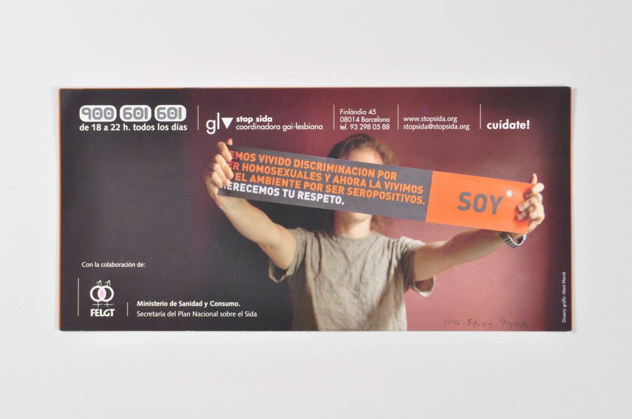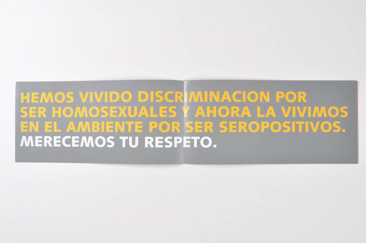 A l'intérieur, le recto est à fond orange. Le feuillet de gauche présente les visages de trois hommes souriant. Le feuillet de droite porte une inscription en capitales grises sur toute la surgace (sauf Seropositivo inscrit en blanc).