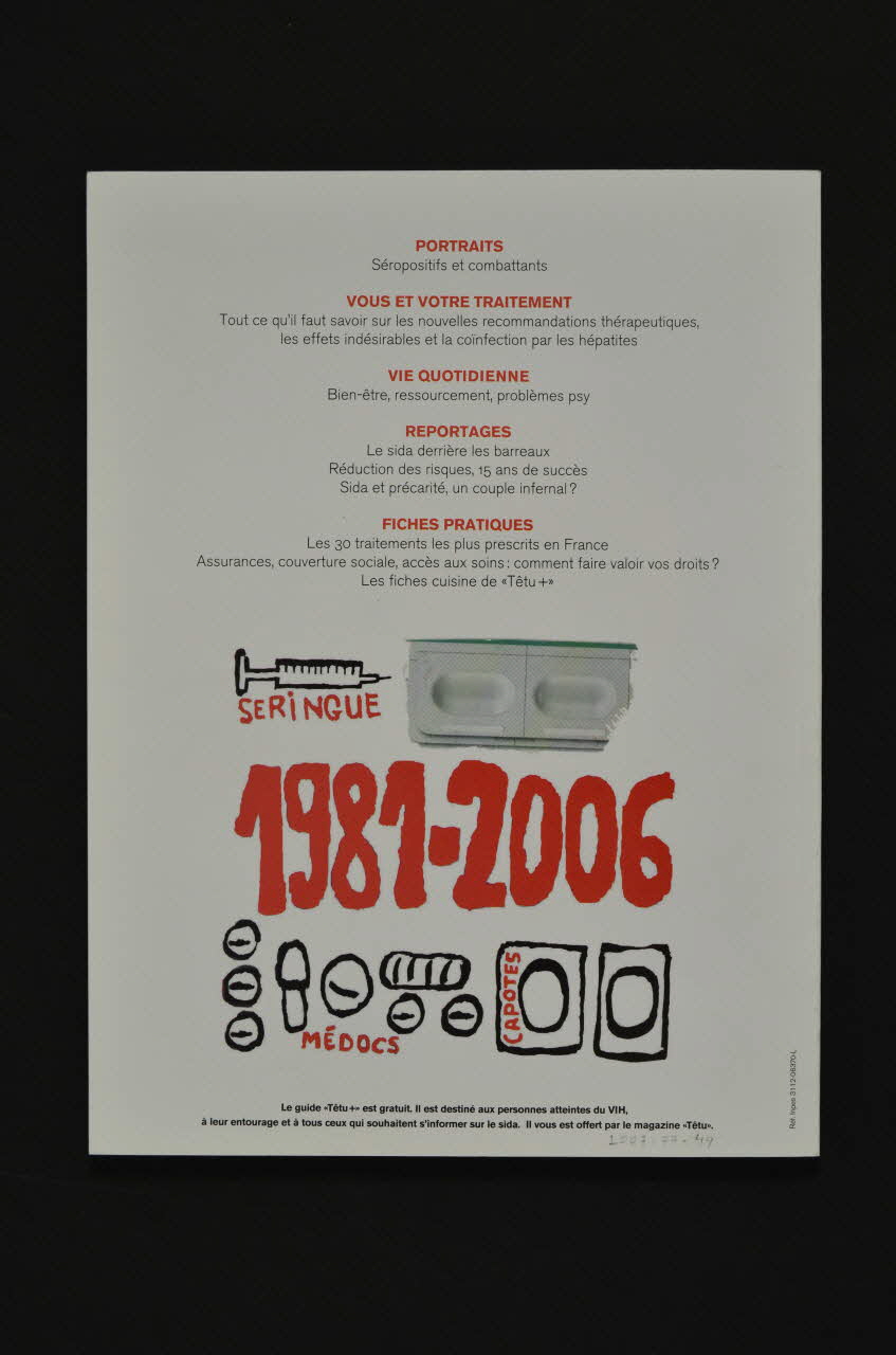 Résumé: - p.6-9 Rubrique Portraits (titre de rubrique en rouge): "Séropositifs et combattants". "Ils vivent avec le VIH depuis plus de 20 ans. Chacun à son rythme est un jour sorti de l'anonymat pour rejoindre des associations, dénoncer le scandale de leur contamination et l'isolement dans lequel sont souvent laissés. Les épreuves sont parfois rudes, les combats incessants. Peut-on alors vraiment prendre du recul quand on se bat quotidiennement contre l'ignorance?. Témoignages de Ludovic Bouchet (avec photo couleur pleine page), Maxime Journiac (photo en demi page), Catherine Kapusta (photo en demi page) - p.10-13 Rubrique Prévention - "Protect Yourself !" "Il faut se protéger en toutes circonstances. Une fois que l'on a dit cela, on a tout dit et pourtant la pratique se révèle parfois plus compliquée qu'il n'y paraît. Le guide Têtu + passe en revue les questions qui peuvent se poser à vous lors d'un rapport sexuel. Photos couleur légendées de : préservatif masculin, gel lubrifiant, gant en latex, préservatif féminin, digue dentaire. Encart en noir et vert : témoignage de Christophe, 41 ans (petite photo) : "Quand tu dis à un mec avec qui ça colle : "je suis séropo", il te répond : pas de problème". Et puis, il n'appelle plus." - "Le traitement post exposition" "Un traitement post exposition permet de réduire les risques de contamination. des conditions de son attribution aux conseils à suivre, tour d'horizon d'une trithérapie souvent mal connue." Photos couleur légendées : Stéribox et godemiché. Encart sur Sida info Service. - "Tout savoir sur les infections sexuellement transmissibles" - p. 14-15 Double page couleur de l'image INPES (carte postale) : "Ne vous laissez pas infecter par les idées reçues. Rumeur n°4 : Avec une charge virale indétectable, on est moins contaminant" - p.16-21 Rubrique Reportage (couleur dominante dans les titres : le rouge) : "Le sida derrière les barreaux" : "Un détenu sur 100 est séropositif et près d'un tiers serait atteint par une hépatite C ou B. Vivre enfermé est une épreuve, d'autant plus lorsqu'on doit gérer sa maladie dans un lieu où tout se sait et tout se voit. Si la prise en charge médicale semble s'être améliorée en détention, beaucoup de dysfonctionnements sont inlassablement dénoncés. Pour la première fois, Têtu + a pu réaliser un reportage dans un établissement pénitentiaire, celui de Villeneuve-lès-Maguelone." Témoignage : "Rencontre avec T, 46 ans, détenu et séropositif." Interview de Fadi Meroueh, médecin coordinateur de l'Ucsa de la maison d'arrêt de Villeneuve-lès-Maguelone : "Je propose aux arrivants plusieurs dépistages : VHA, VHC, VIH et syphilis" - p.22-30 Rubrique Mon Traitement (couleur dominante : le bleu) - "Félicia David-Ouaknine, médecin à Lagny-sur-Marne : "Socialement, la situation des malades est plus difficile qu'il y a deux ans" - "Des objectifs médicaux toujours plus ambitieux" - "Comment faire face aux effets secondaires". En encart, témoignages avec petites photos de Eric 39 ans : "Mon ostéoporose a été découverte l'année dernière" et de Chantal, 46 ans :" j'arrive à pallier certains effets indésirables à l'aide de l'alimentation, l'acupuncture et l'homéopathie."Encadré : "Le coeur et le VIH font-ils bon ménage ?". - "Participer à un essai clinique" - Témoignage : "Marylène, 60 ans : J'ai perdu pas mal de masse musculaire" - Femmes séropositives, tout ce que vous devez savoir". Encart : "De la nécessité d'en parler." - p.31 Rubrique Portraits (titre en blanc) : "Que sont-ils devenus ?" : "Nous les avons rencontrés à l'occasion des précédentes éditions du guide Têtu +. Quelques années plus tard, certains ont disparu, d'autres poursuivent leur engagement contre le sida." - p.32-35 Rubrique Coinfection (couleur dominante, le rouge) - Les traitements contre les hépatites B, C et D. - Professeur Didier Samuel, investigateur de l'essai Thevic : "Nous commençons à avoir de bons résultats avec la transplantation - Dix conseils pratiques pour supporter son traitement. - p.36-41 Rubrique Reportage (couleur dominante, le rouge) : "Réduction des risques, quinze ans de succès" "Certains en parlent comme du plus grand succès de santé publique de ces dernières années. Elle reste pourtant fragile et sans arrêt remise en cause... La politique de réduction des risques cherche aujourd'hui un second souffle et doit s'adapter aux nouveaux usagers de drogues. / Interview de Malika Tagounit, coordinatrice du Point Ecoute de la gare du Nord, Paris. Il vaut mieux avoir de petites exigences et accepter le moindre mal." - p.42-49 Rubrique Droits sociaux (couleur dominante, le violet) : "Droits des malades, un tableau contrasté" / "Vos démarches en pratique" : "Prestations versées aux adultes handicapés / Couverture maladie universelle / Aide Médicale d'Etat / Les droits des malades / Le Pacte civil de solidarité / L'emploi / Le protocole de soins / L'accès à l'assurance / La suspension de peine" / Encarts : témoignages de Yves, 39 ans : "Ce qui est le plus dur, c'est de se battre avec la paperasse" et de Didier, 34 ans :"Le plus dur, c'est le manque d'accompagnement social." - p.50-55 Rubrique Vie quotidienne (couleur dominante, le rouge) - Didier Vilarrubla, directeur de la Contremarque, Noisy-le-Sec : "L'art peut aider à la réinsertion" - Encart : Fiches cuisine diététique - Comment être mieux dans sa peau - Problèmes psy : n'ayez pas peur d'en parler - Mon ventre, j'en prends soin - Faire un break avec les soeurs (photo) - Vaccinez-vous ! - p.56-63 Rubrique Reportage (couleur dominante, le rouge) - Sida et précarité, un couple infernal ? / Les migrants, victimes du silence - 25 ans de combat dans le monde - p.64-95 Rubrique traitements (couleur dominante : le bleu) - Carine Couzigou, infectiologue à l'hôpital Paul Brousse, Villejuif :"Je prends forcément en compte la parole du patient" - Antirétroviraux. Plus simples
