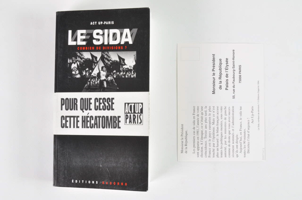 La couverture est illustrée d'une photograhpie noir et blanc, partagée en trois, présentant des manifestants d' Act Up. Autour du livre est placé un bandeau blanc avec une inscription en lettres noires. A l'intérieur, on trouve une note de l'éditeur disant que les bénéfices seront reversés à Act Up-Paris. La quatrième de couverture présente le but du livre. A l'intérieur du livre est glissée une carte postale en carton, dont la face, blanche, présente un disque noir portant le slogan. La carte est adressée à Monsieur le Président de la République.Inscriptions