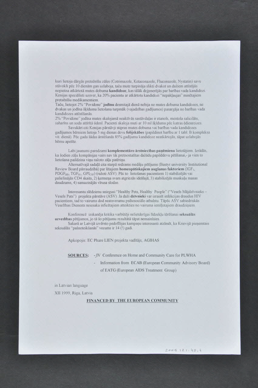 Skrejlapa #3 no serijas ("Jaunumi ni IV Starpautiskas konferences parize, 5-8 XII, 99 "HIV Inficéto Mâjas un sabiedriskâ aprûpe"), recto, rectoPar Labaku HIV-Inficeto dzives Kvalitâti !, rectoDécor
