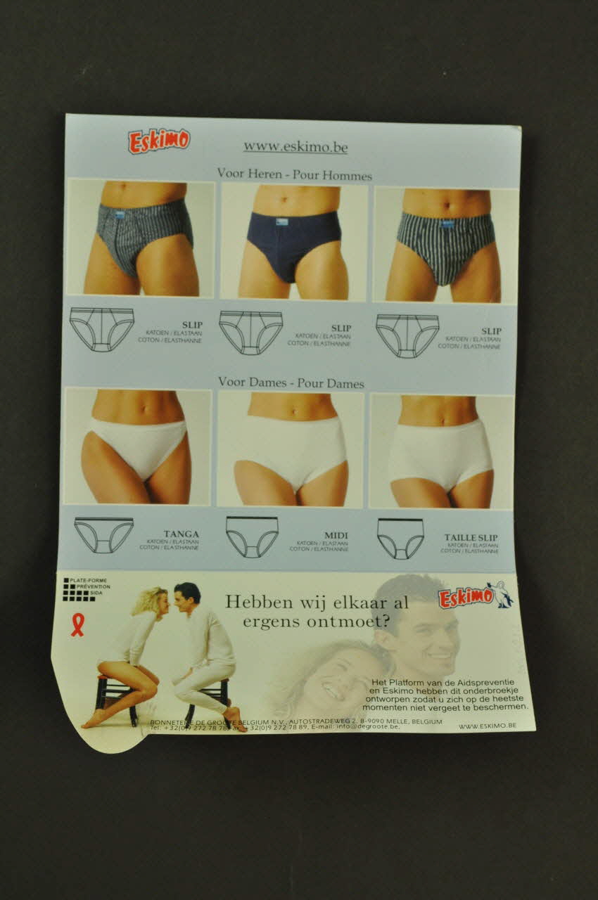 En dessous, sont présents les logos de la Plate forme Prévention Sida et d'Eskimo. Sur le rabat, il y a les dimensions et des conseils de lavage. A l'intérieur du carton, sont représentés d' autres modèles de sous vêtements Eskimo.Inscriptions