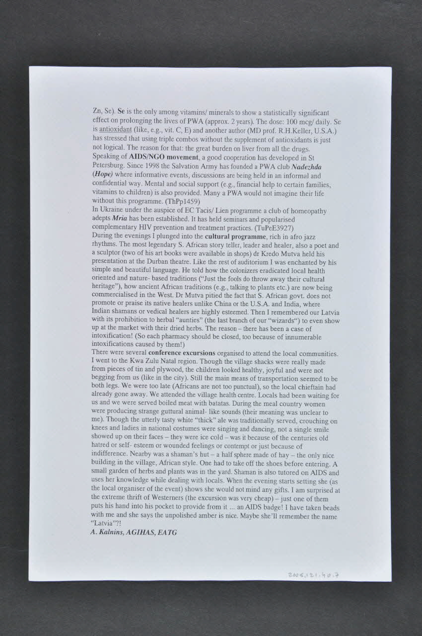 Il s'agit d'une feuille de papier machine au format A4 imprimée en noir sur ses deux faces. En haut on peut voir le titre en gras et en grandes capitales. Le texte est en anglais, il est signé au verso en bas.Inscriptions
