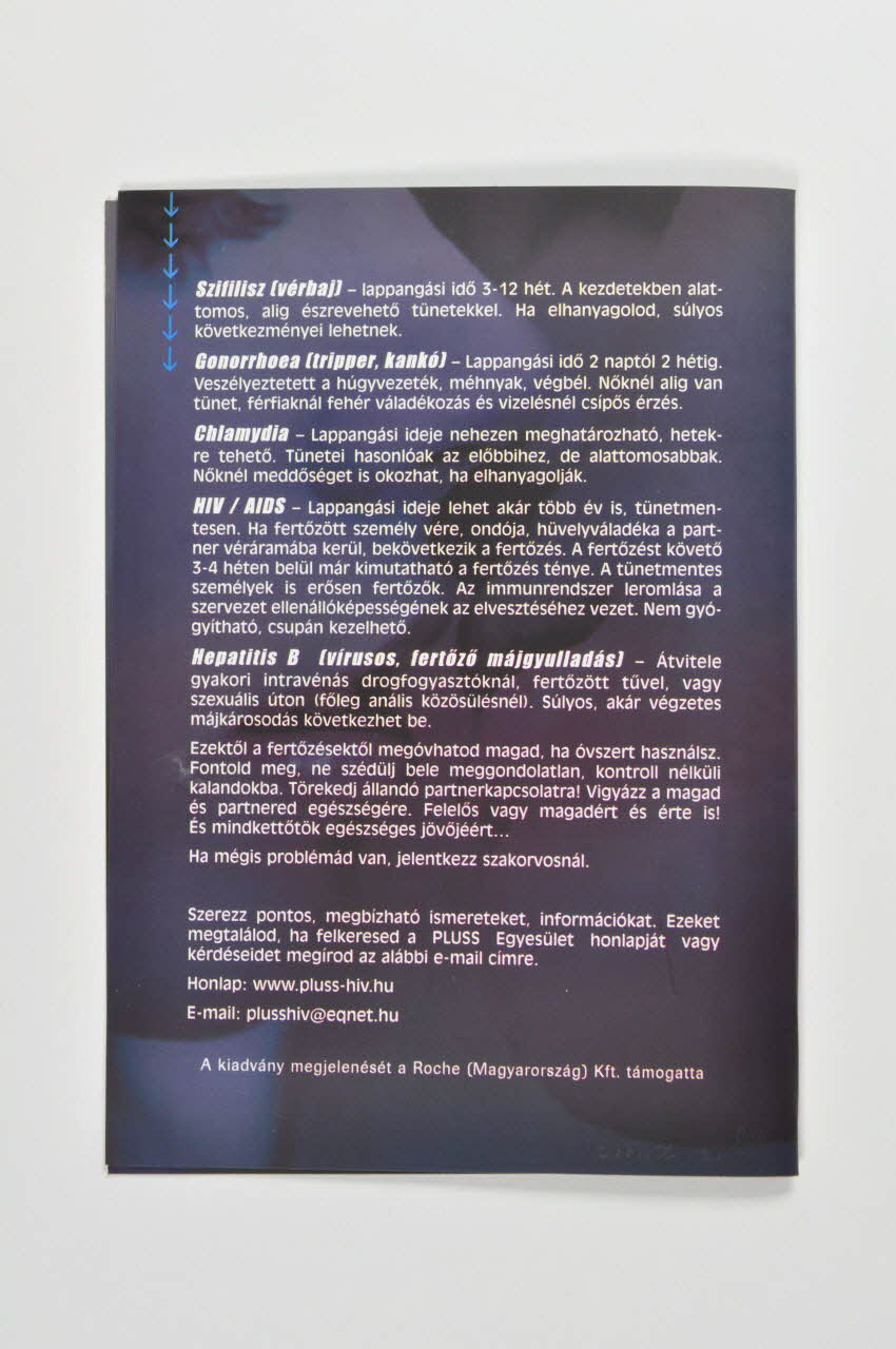 Le feuillet 2 et le dos sont à fond bleu sombre, et présentent des impressions en blanc, diffusant des informations et liste des maladies sexuellement transmissibles dont le sida.
