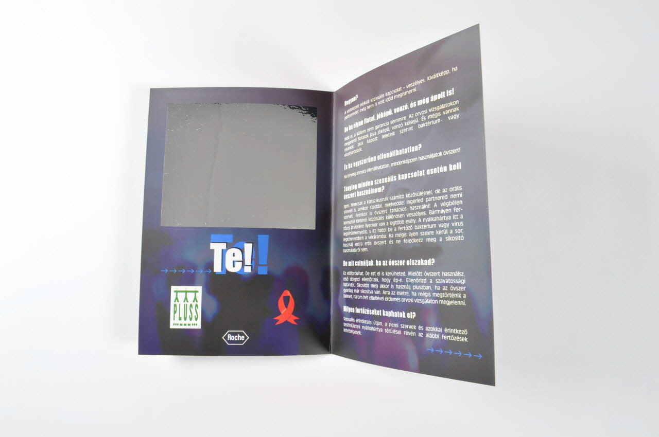 A l'intérieur, le feuillet 1 à fond bleu sombre présent un rectangle de papier aluminium formant un miroir avec en dessous, en blanc surligné de bleu l'inscription "Te" (Toi). On trouve également les logos de Pluss et de Roche et petit ruban rouge.