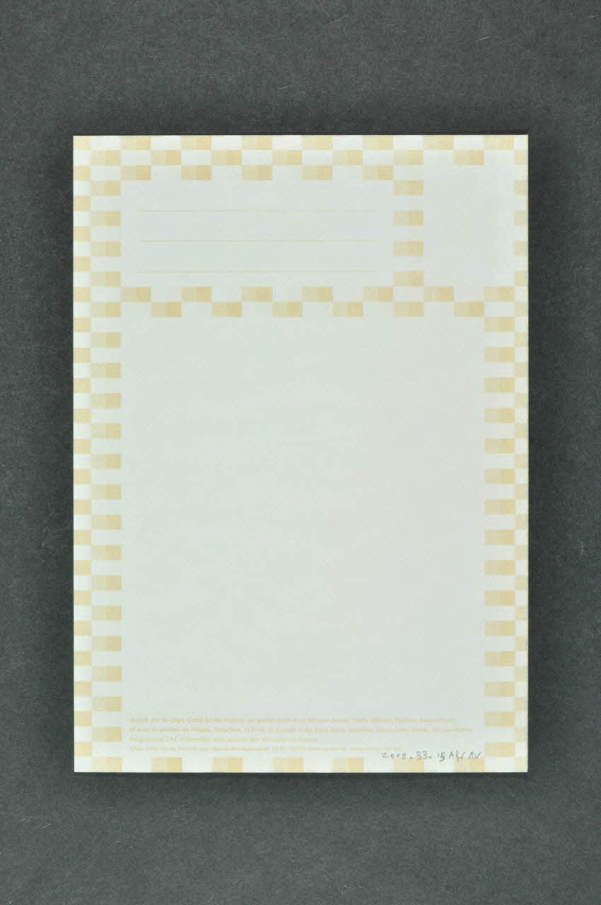 De forme rectangulaire, la carte postale en carton se lit verticalement. Au recto figure la photographie couleur d'une femme en buste. A gauche de son visage se trouvent deux phylactères rectangulaires contenant des inscriptions bleues et blanches. En dessous des inscriptions blanches sont imprimées sur un rectangle marron. Tout autour du recto est disposé un damier blanc, marraon, bleu et noir aux bords irréguliers. Au verso, sur un fond blanc, on retrouve un damier dans les tons beiges à orange. Le damier délimite les espaces dédiés au timbre et à l'adresse. En partie inférieure apparaissent des inscriptions beiges.Inscriptions