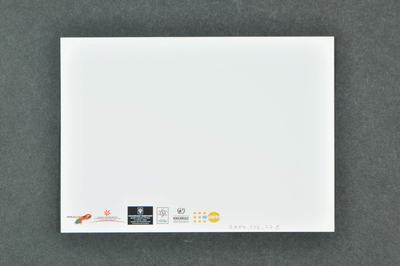 Au recto, à gauche il y a la représentation d'un tableau, dans un intérieur de maison, un enfant debout avec un chien, à gauche. A droite, autour d'une table, la mère et deux enfants les regardent. A droite, un texte, en cyrillique, écrit en noir et rouge sur un fond blanc.