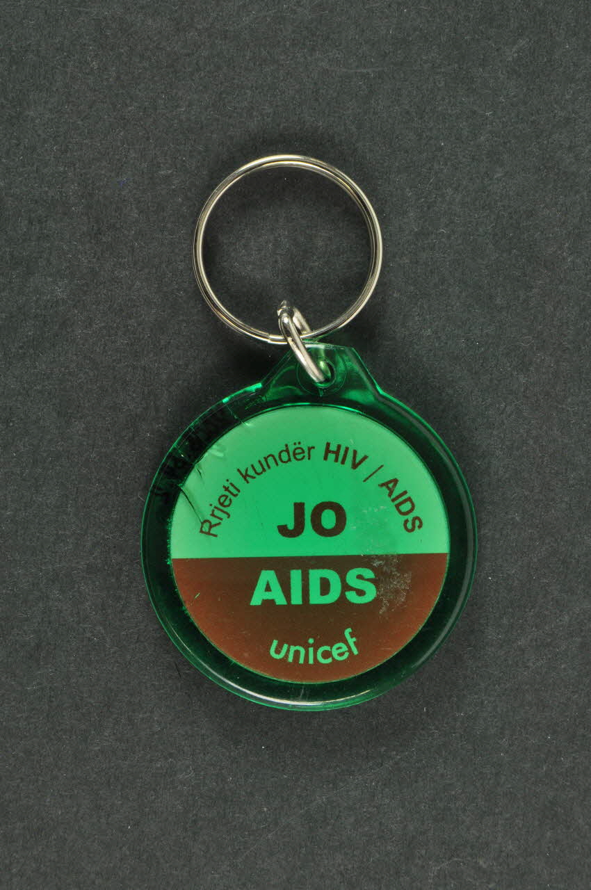 Ce porte-clef en plastique de forme ronde et de couleur verte représente sur une face, un préservatif rose sur fond bleu pourvu de deux yeux dont l'un cligne, d'un nez, d'une bouche et de deux bras. L'autre face laisse apparaître des inscriptions.Décor