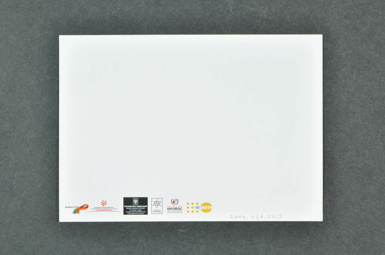Elle est imprimée en couleur et est écrite en cyrillique. Au recto, à gauche il y a la représentation d'un tableau, une scène d'ésclavage, cinq hommes et une femme, attachés. A droite, un texte, en cyrillique, écrit en noir et rouge sur un fond blanc. Au verso, le fond et blanc. Six logos figurent en bas à gauche, deux sont inscrits en anglais.Décor